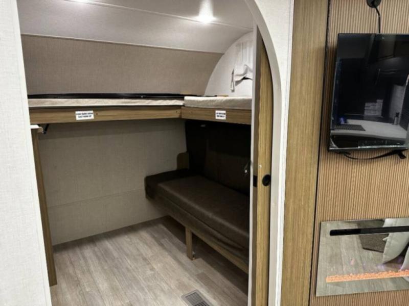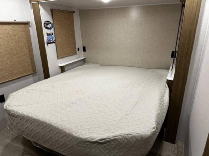 You're going to love this Wildwood travel trailer and its unique layout. The private bunkhouse is up front, and the private bedroom is at the rear of the unit. You will love the walk-through bath that leads into the bedroom, and the custom king bed with Versa Tilt slide out provides more interior space. The kids will love the front private bunkhouse with its Versa queen bed and Versa bunk beds. This model also includes an 18' awning that will shade you during the day and create an outdoor living space you are sure to love.