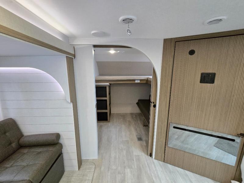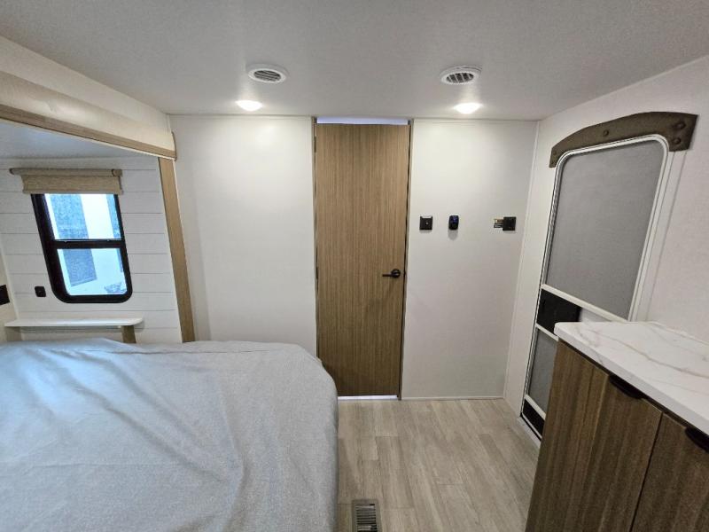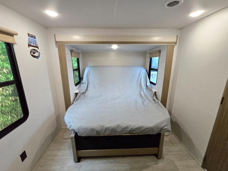 You're going to love this Wildwood travel trailer and its unique layout. The private bunkhouse is up front, and the private bedroom is at the rear of the unit. You will love the walk-through bath that leads into the bedroom, and the custom king bed with Versa Tilt slide out provides more interior space. The kids will love the front private bunkhouse with its Versa queen bed and Versa bunk beds. This model also includes an 18' awning that will shade you during the day and create an outdoor living space you are sure to love.