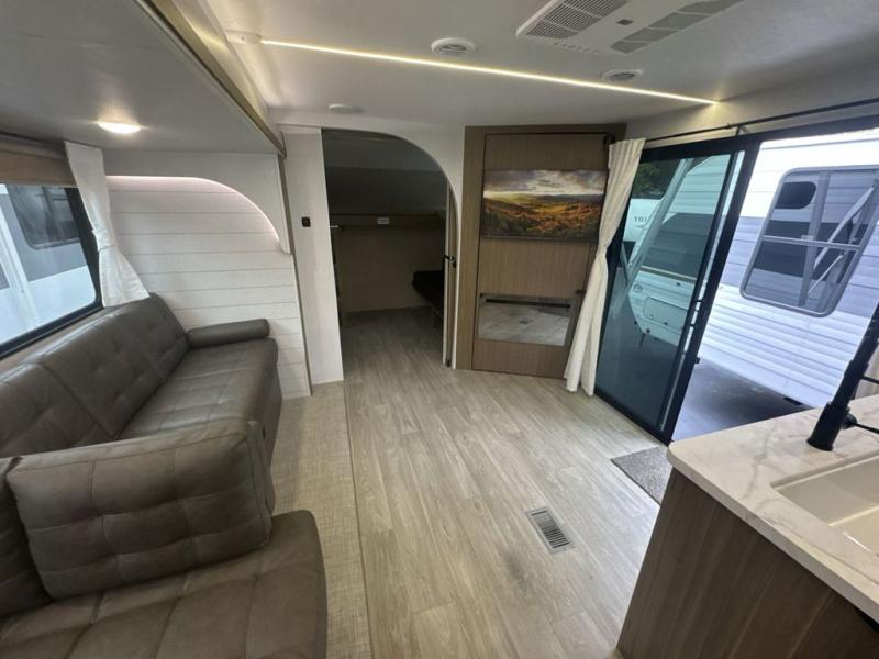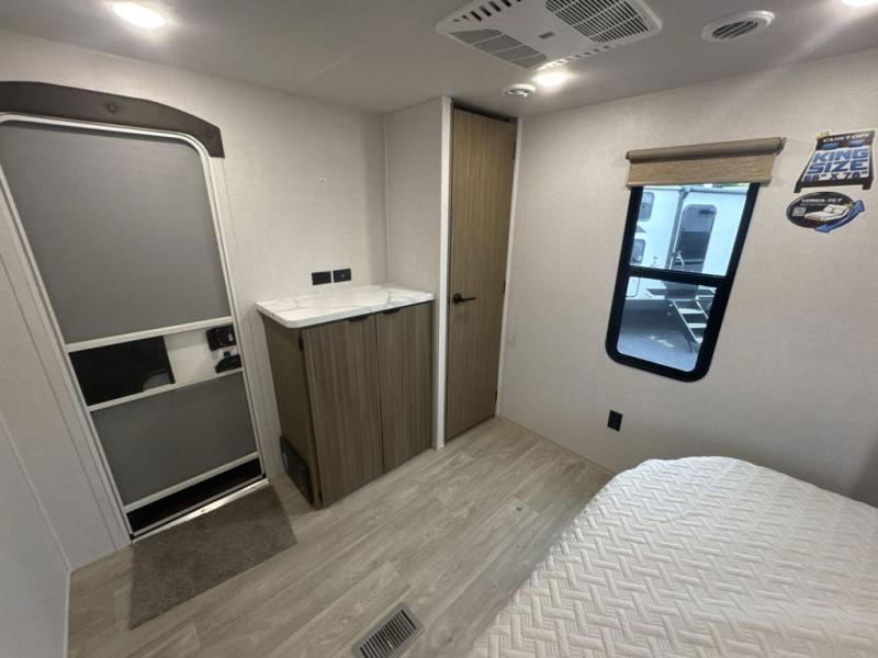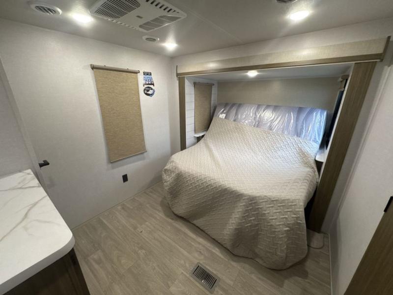 You're going to love this Wildwood travel trailer and its unique layout. The private bunkhouse is up front, and the private bedroom is at the rear of the unit. You will love the walk-through bath that leads into the bedroom, and the custom king bed with Versa Tilt slide out provides more interior space. The kids will love the front private bunkhouse with its Versa queen bed and Versa bunk beds. This model also includes an 18' awning that will shade you during the day and create an outdoor living space you are sure to love.