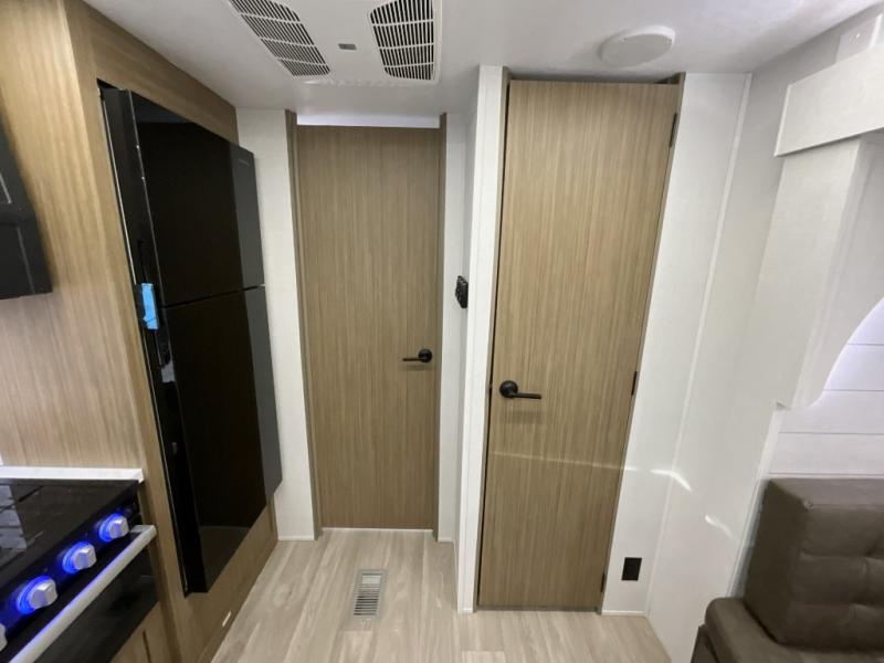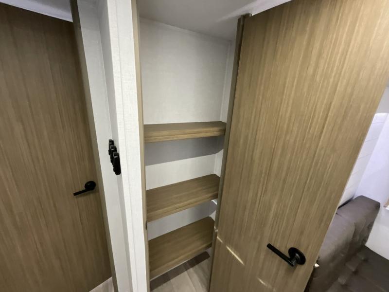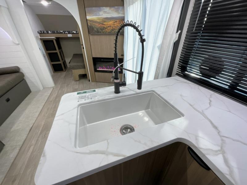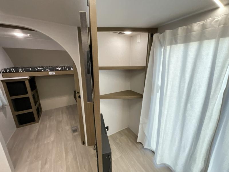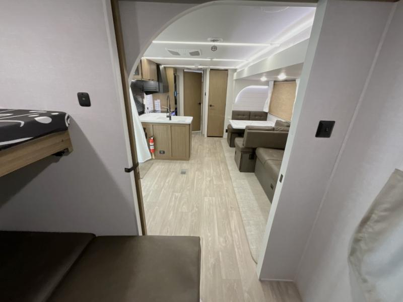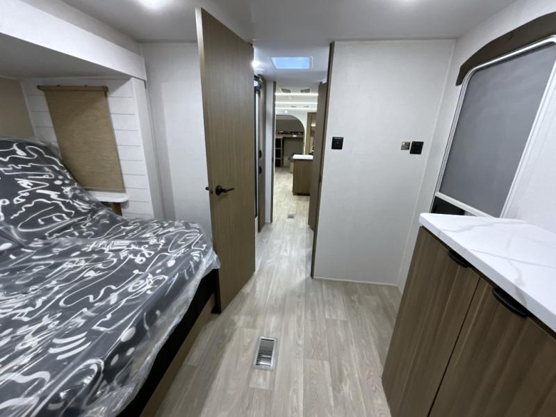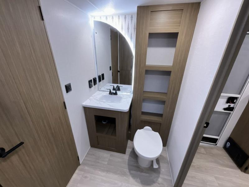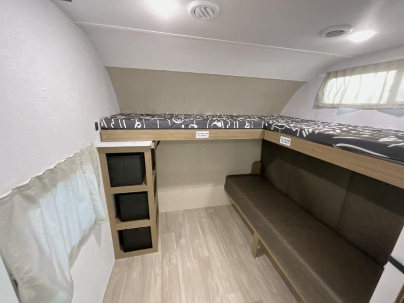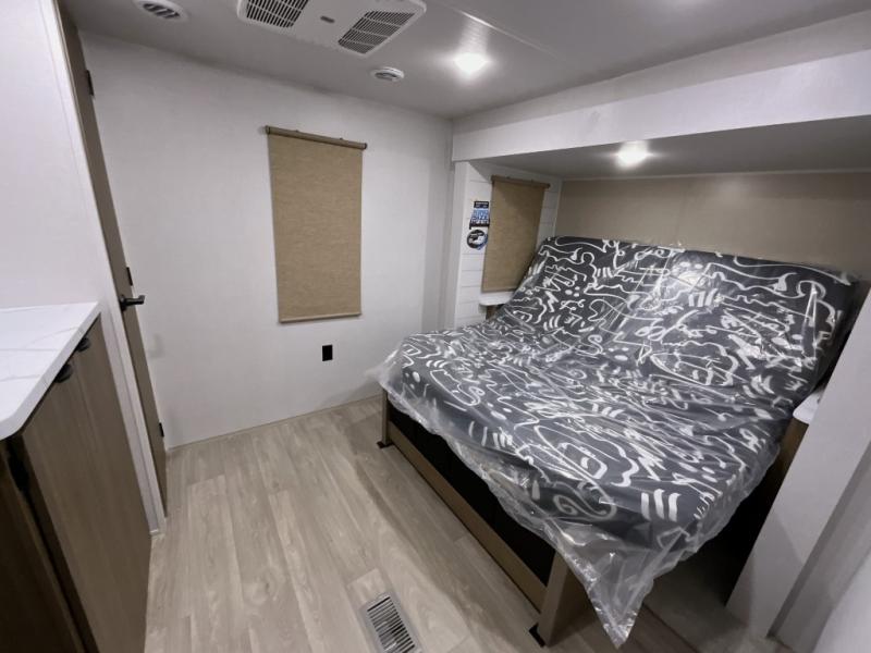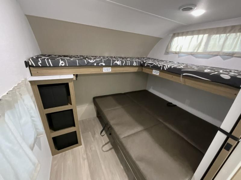 You're going to love this Wildwood travel trailer and its unique layout. The private bunkhouse is up front, and the private bedroom is at the rear of the unit. You will love the walk-through bath that leads into the bedroom, and the custom king bed with Versa Tilt slide out provides more interior space. The kids will love the front private bunkhouse with its Versa queen bed and Versa bunk beds. This model also includes an 18' awning that will shade you during the day and create an outdoor living space you are sure to love.
