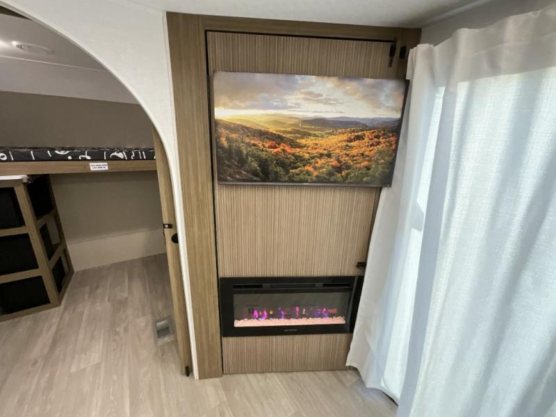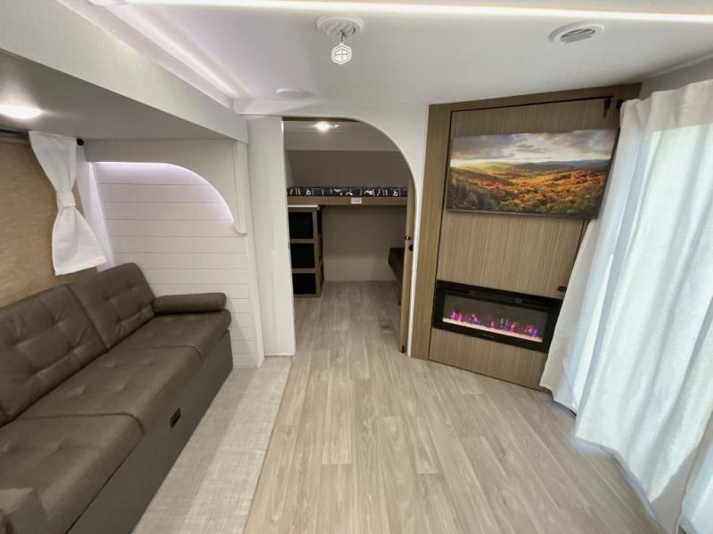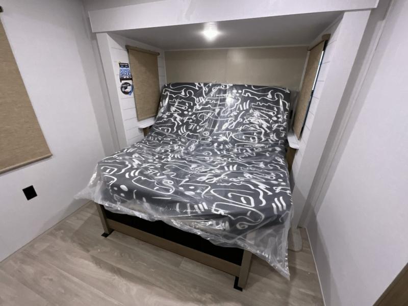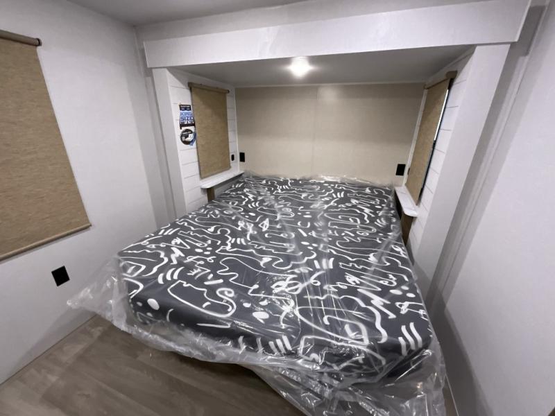 You're going to love this Wildwood travel trailer and its unique layout. The private bunkhouse is up front, and the private bedroom is at the rear of the unit. You will love the walk-through bath that leads into the bedroom, and the custom king bed with Versa Tilt slide out provides more interior space. The kids will love the front private bunkhouse with its Versa queen bed and Versa bunk beds. This model also includes an 18' awning that will shade you during the day and create an outdoor living space you are sure to love.