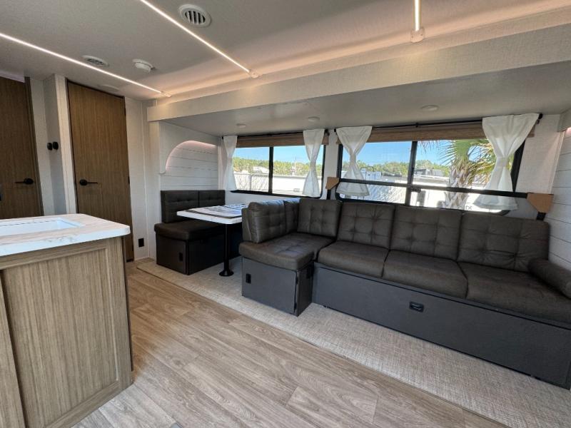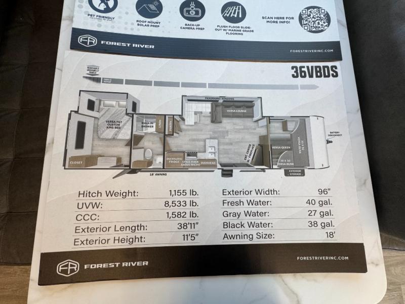 The 36VBDS is a unique, versatile bunkhouse that offers ample sleeping options so you can bring everyone camping! The front bedroom offers both the Versa-Queen and Versa-bunks, while the rear bedroom provides a queen bed, dresser, and closet. The living area features the fantastic Versa-Lounge with panoramic windows for great campsite views. Do not forget about the Stow N Go Storage conveniently below the Versa-Lounge.