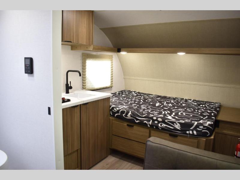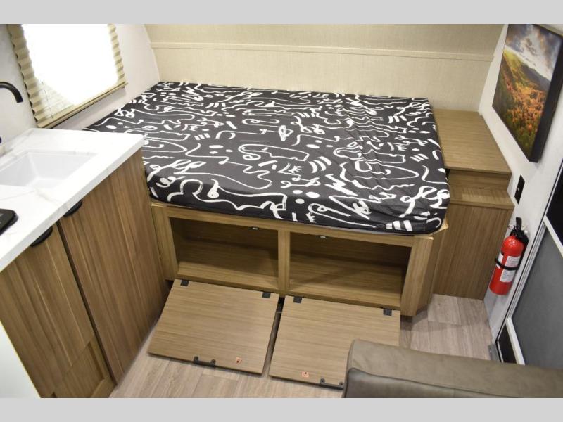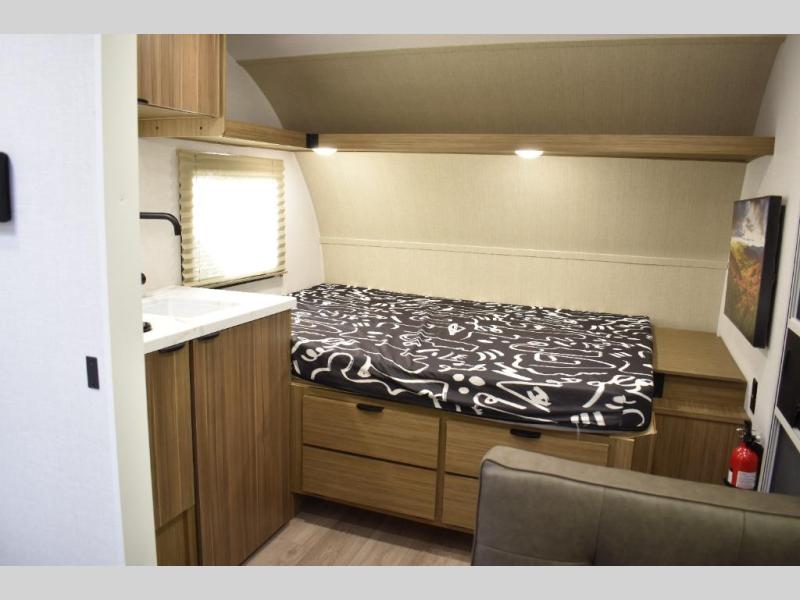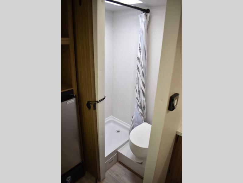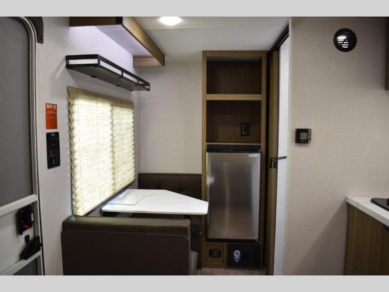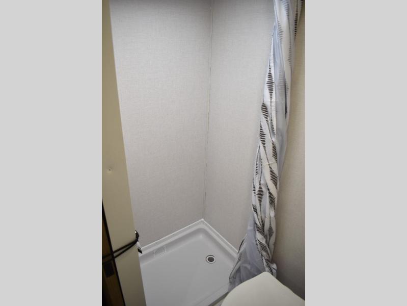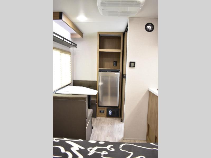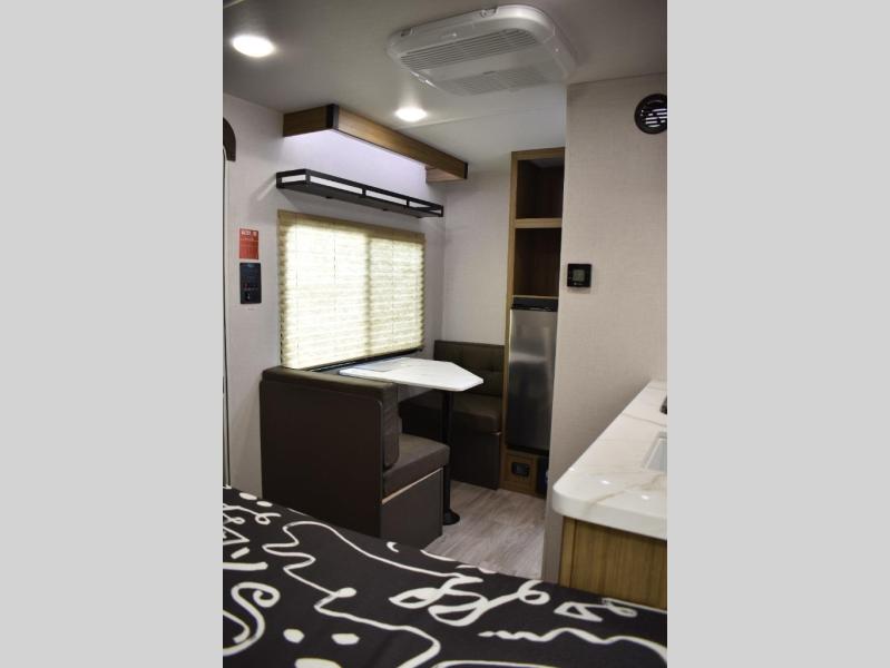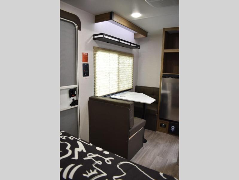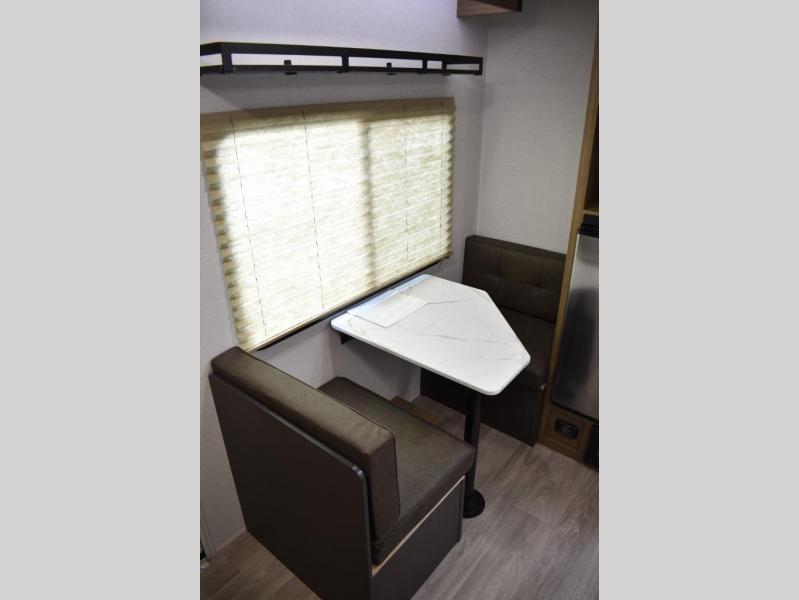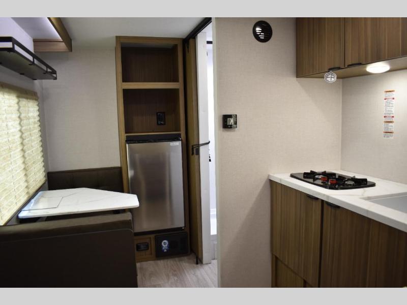 This lightweight travel trailer has everything you need to enjoy camping trips! There is a front east to west custom king bed with storage at the foot of the bed and overhead for your valuables. A private bath includes a toilet and walk-in shower so you can easily get ready each day, and you can prepare your meals on the two-burner cooktop when you get hungry. The booth dinette will provide dining space, along with sleeping space for one to two little ones. Don't let this trailer get away!