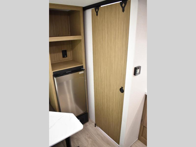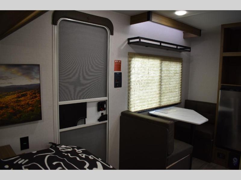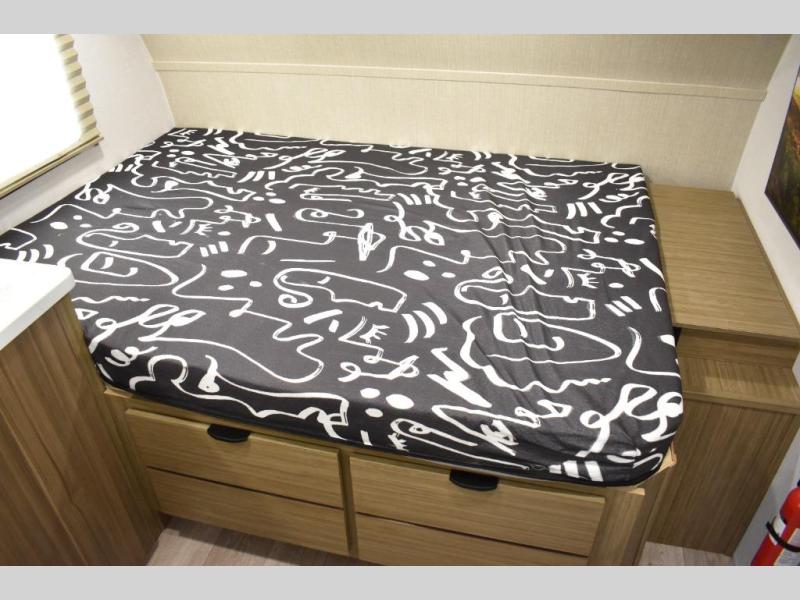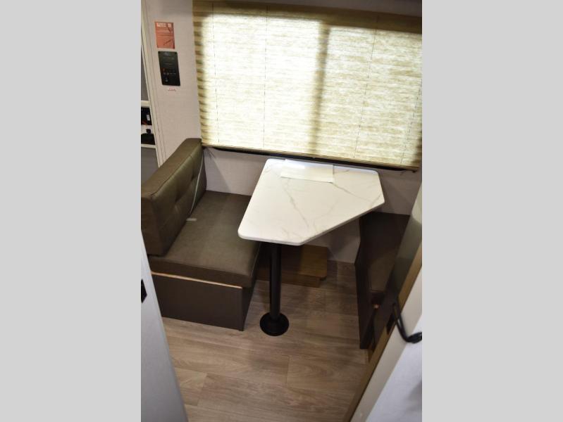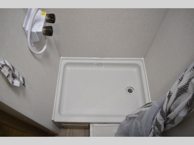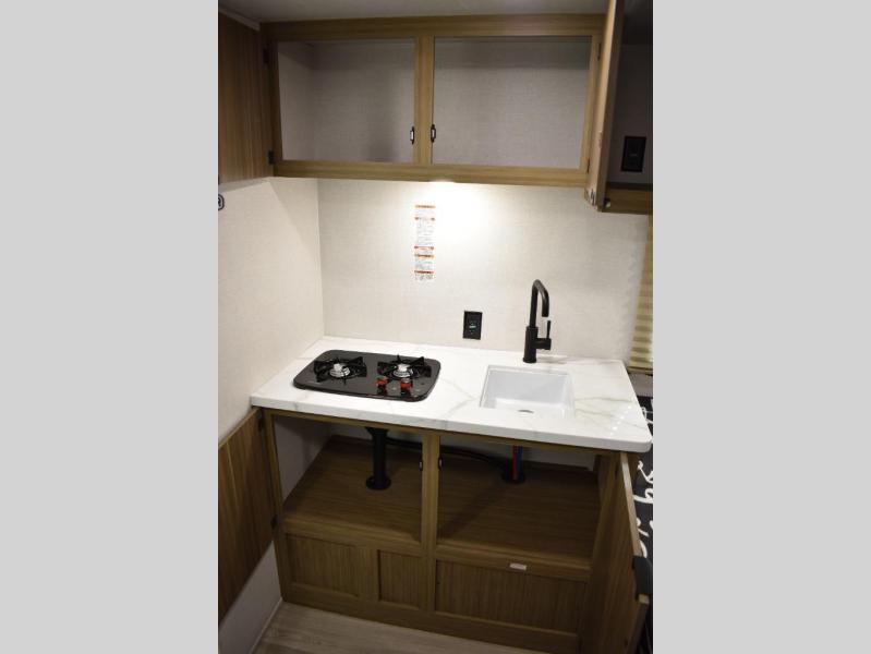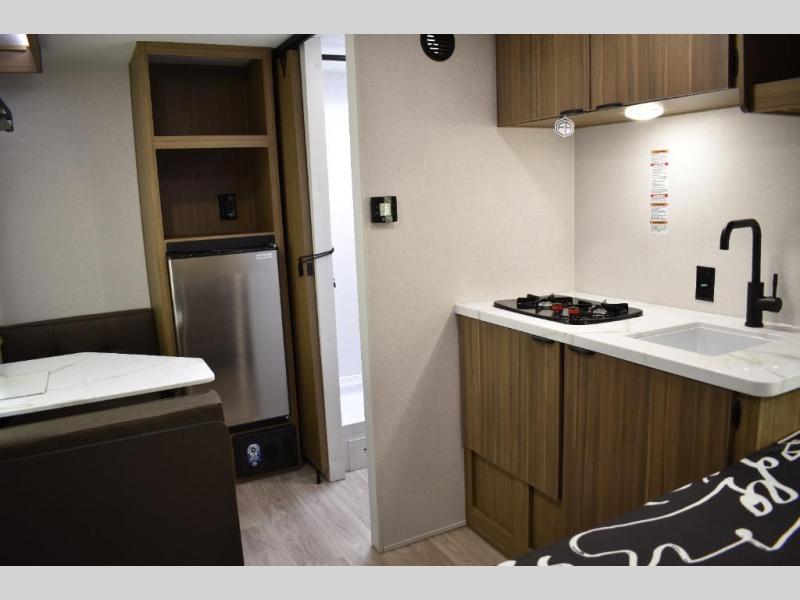 This lightweight travel trailer has everything you need to enjoy camping trips! There is a front east to west custom king bed with storage at the foot of the bed and overhead for your valuables. A private bath includes a toilet and walk-in shower so you can easily get ready each day, and you can prepare your meals on the two-burner cooktop when you get hungry. The booth dinette will provide dining space, along with sleeping space for one to two little ones. Don't let this trailer get away!
