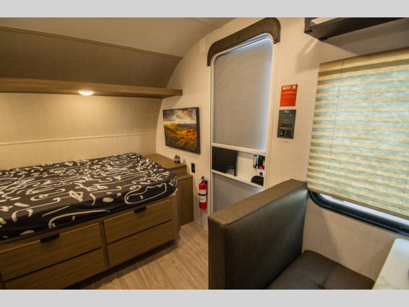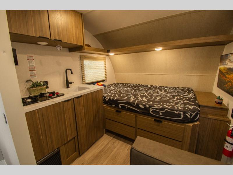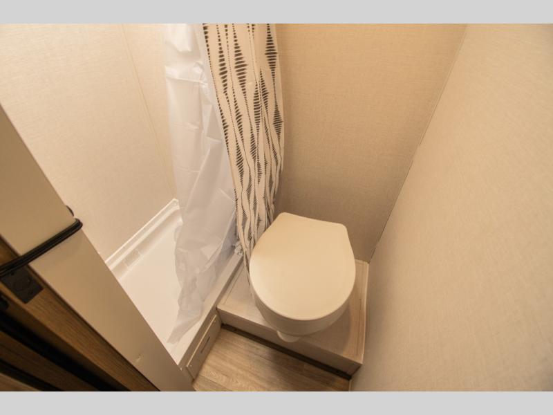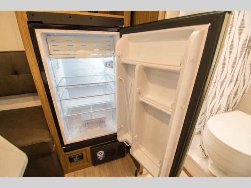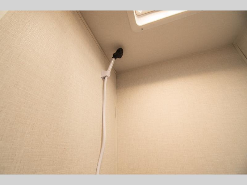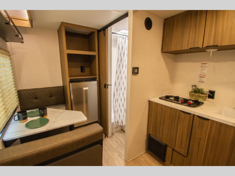 A private bathroom with a walk-in shower makes daily routines easy, and the two-burner cooktop paired with a 12V refrigerator covers meals without overcomplicating things. The booth dinette pulls double duty for dining and extra sleeping space, offering flexibility without crowding the layout.