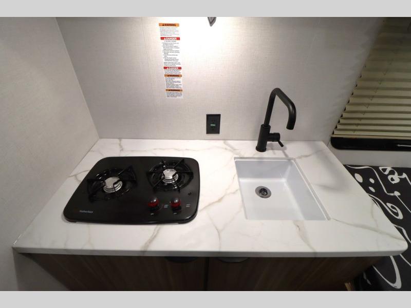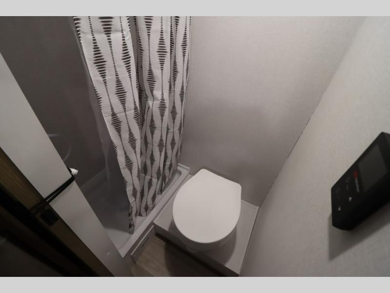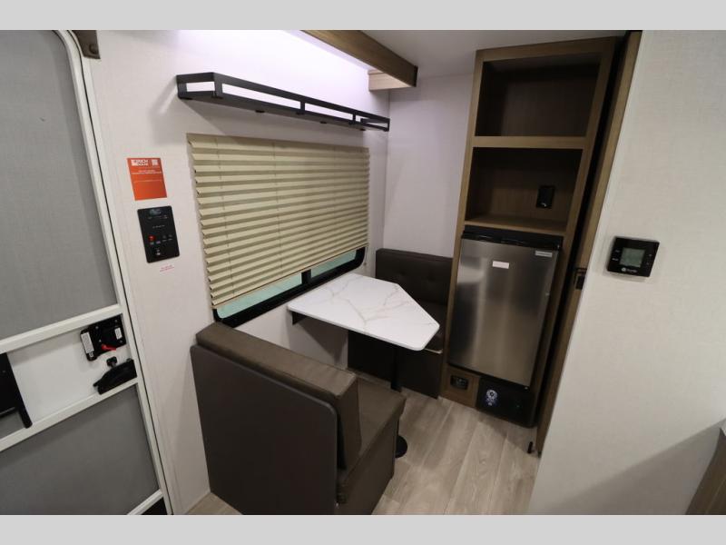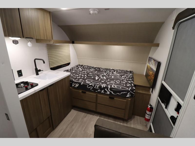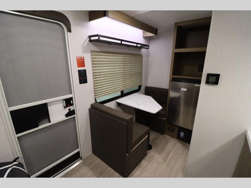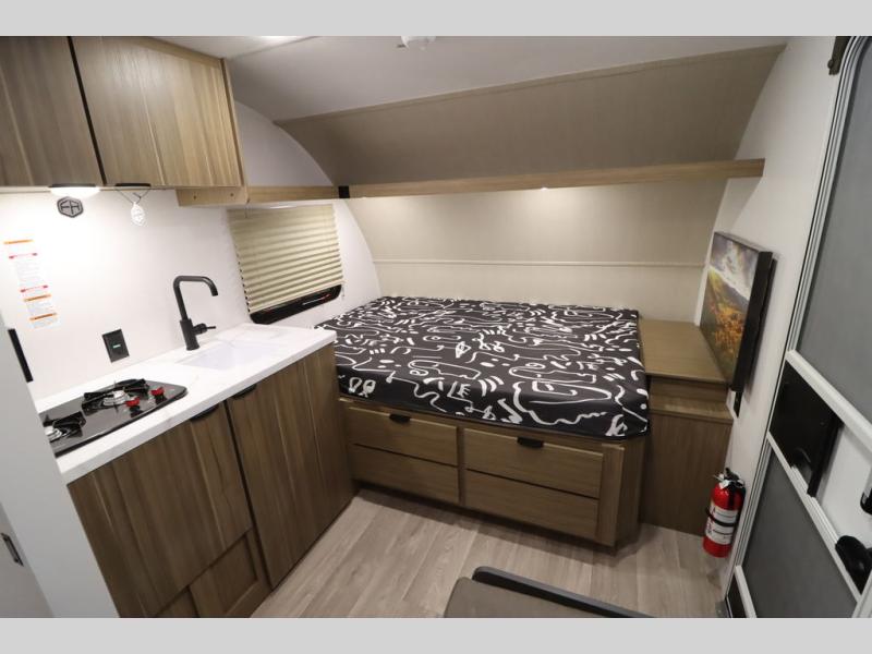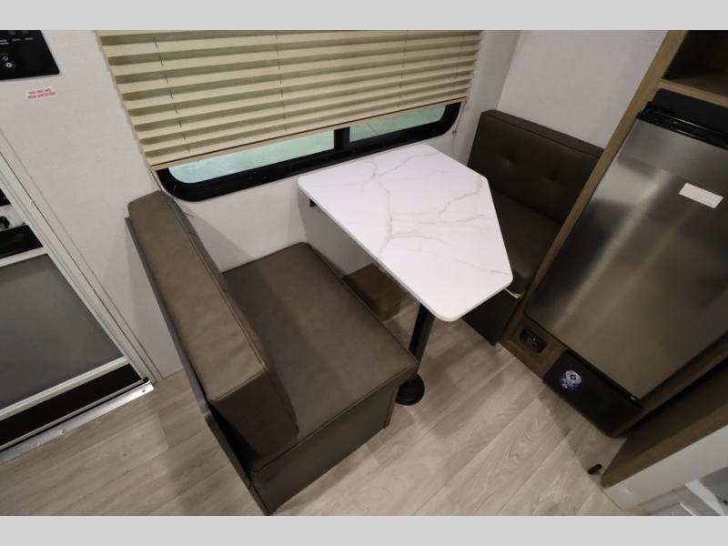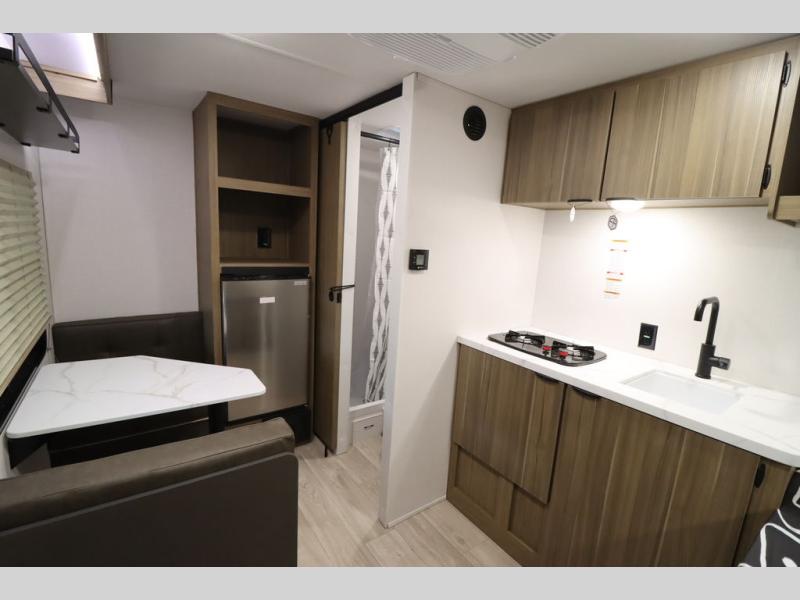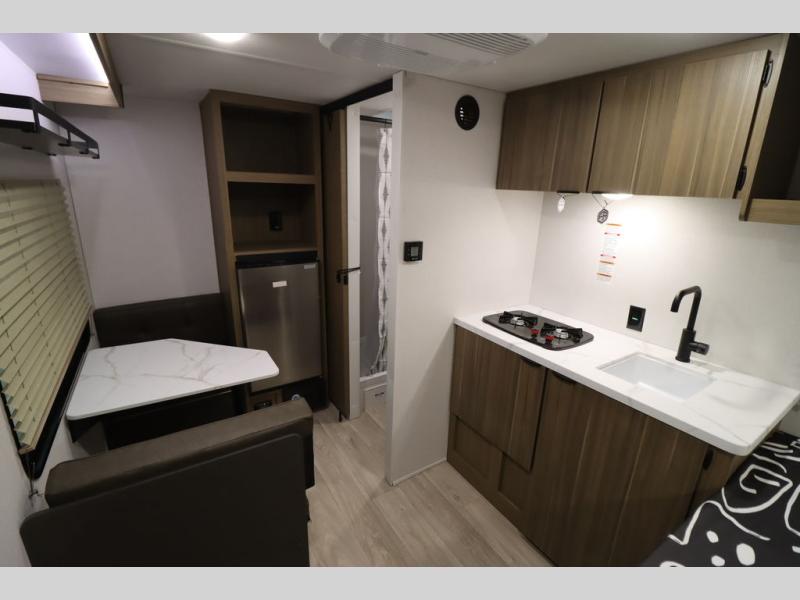 This lightweight travel trailer has everything you need to enjoy camping trips! There is a front east to west custom king bed with storage at the foot of the bed and overhead for your valuables. A private bath includes a toilet and walk-in shower so you can easily get ready each day, and you can prepare your meals on the two-burner cooktop when you get hungry. The booth dinette will provide dining space, along with sleeping space for one to two little ones. Don't let this trailer get away!