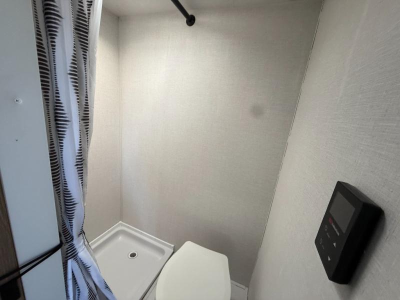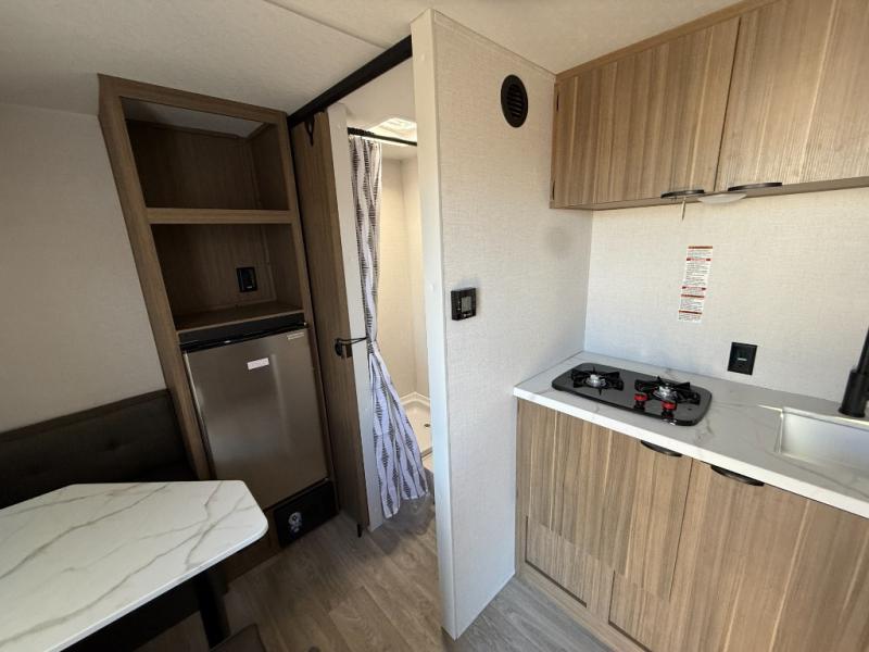 This lightweight travel trailer has everything you need to enjoy camping trips! There is a front east to west custom king bed with storage at the foot of the bed and overhead for your valuables. A private bath includes a toilet and walk-in shower so you can easily get ready each day, and you can prepare your meals on the two-burner cooktop when you get hungry. The booth dinette will provide dining space, along with sleeping space for one to two little ones. Don't let this trailer get away!