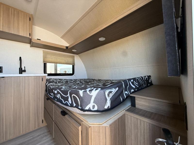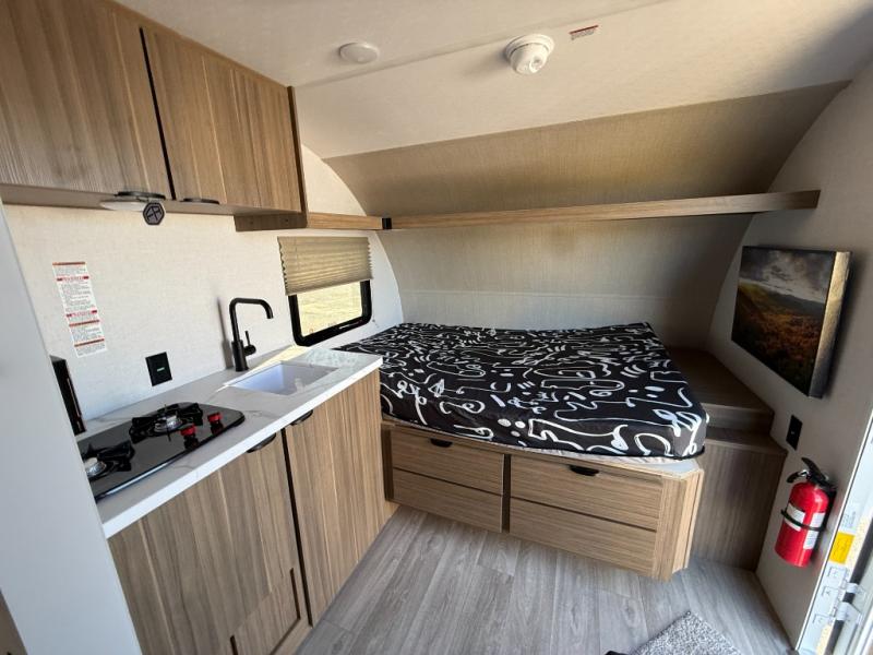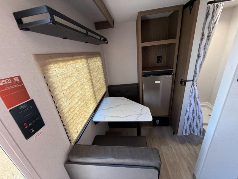 This lightweight travel trailer has everything you need to enjoy camping trips! There is a front east to west custom king bed with storage at the foot of the bed and overhead for your valuables. A private bath includes a toilet and walk-in shower so you can easily get ready each day, and you can prepare your meals on the two-burner cooktop when you get hungry. The booth dinette will provide dining space, along with sleeping space for one to two little ones. Don't let this trailer get away!