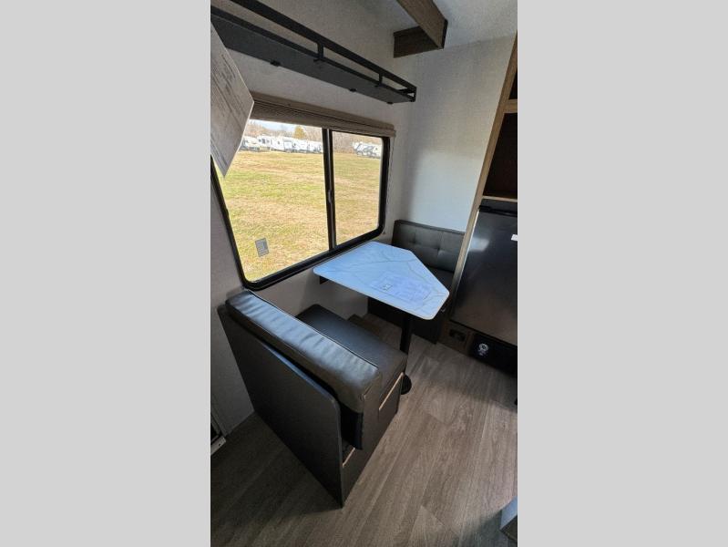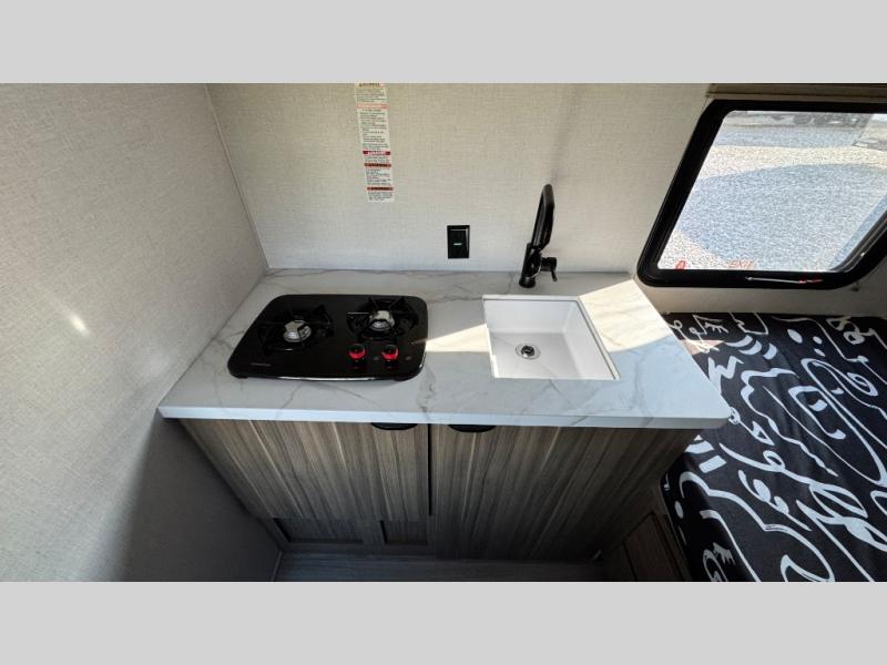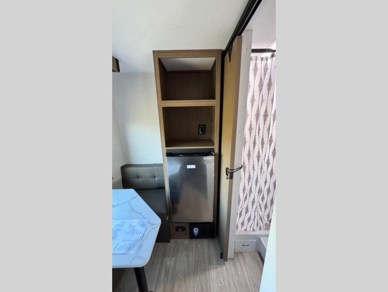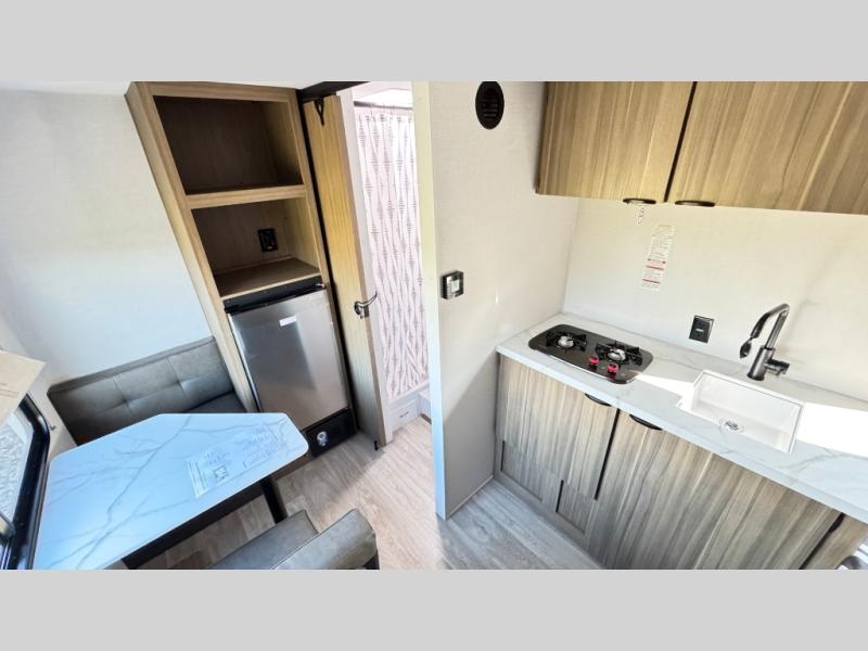 This lightweight travel trailer has everything you need to enjoy camping trips! There is a front east to west custom king bed with storage at the foot of the bed and overhead for your valuables. A private bath includes a toilet and walk-in shower so you can easily get ready each day, and you can prepare your meals on the two-burner cooktop when you get hungry. The booth dinette will provide dining space, along with sleeping space for one to two little ones. Don't let this trailer get away!