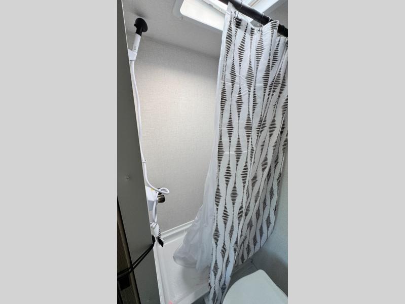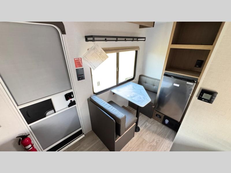This lightweight travel trailer has everything you need to enjoy camping trips! There is a front east to west custom king bed with storage at the foot of the bed and overhead for your valuables. A private bath includes a toilet and walk-in shower so you can easily get ready each day, and you can prepare your meals on the two-burner cooktop when you get hungry. The booth dinette will provide dining space, along with sleeping space for one to two little ones. Don't let this trailer get away!