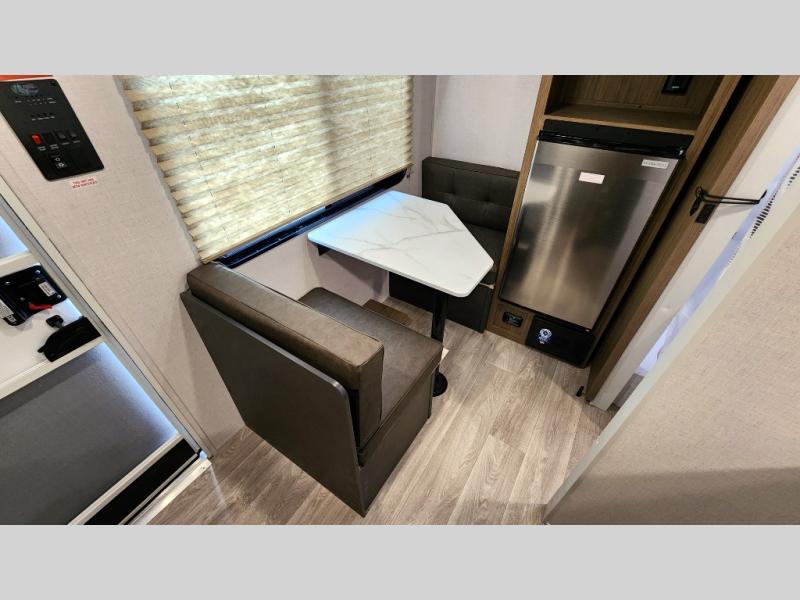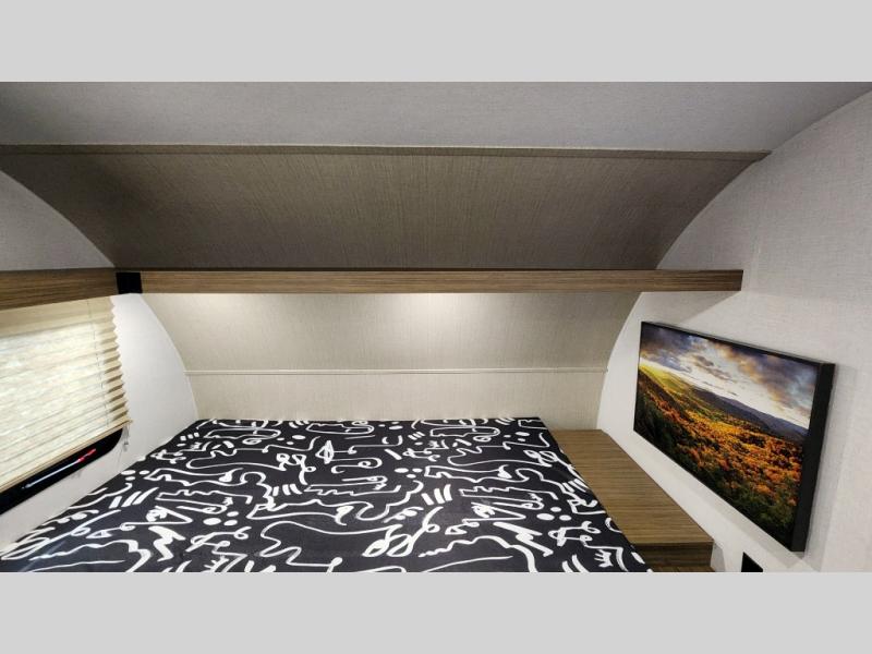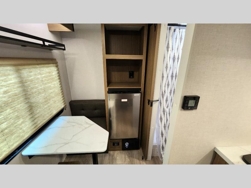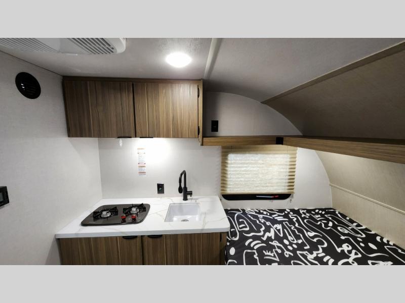 This lightweight travel trailer has everything you need to enjoy camping trips! There is a front east to west custom king bed with storage at the foot of the bed and overhead for your valuables. A private bath includes a toilet and walk-in shower so you can easily get ready each day, and you can prepare your meals on the two-burner cooktop when you get hungry. The booth dinette will provide dining space, along with sleeping space for one to two little ones. Don't let this trailer get away!