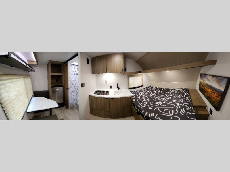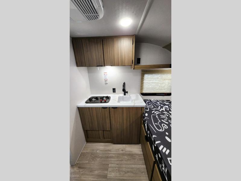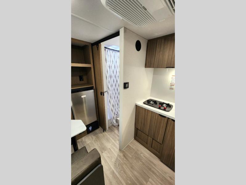 This lightweight travel trailer has everything you need to enjoy camping trips! There is a front east to west custom king bed with storage at the foot of the bed and overhead for your valuables. A private bath includes a toilet and walk-in shower so you can easily get ready each day, and you can prepare your meals on the two-burner cooktop when you get hungry. The booth dinette will provide dining space, along with sleeping space for one to two little ones. Don't let this trailer get away!