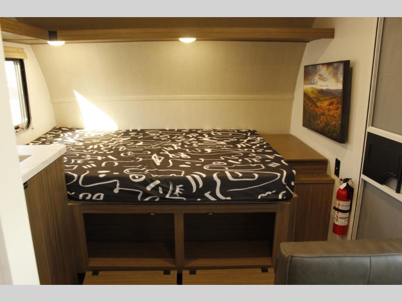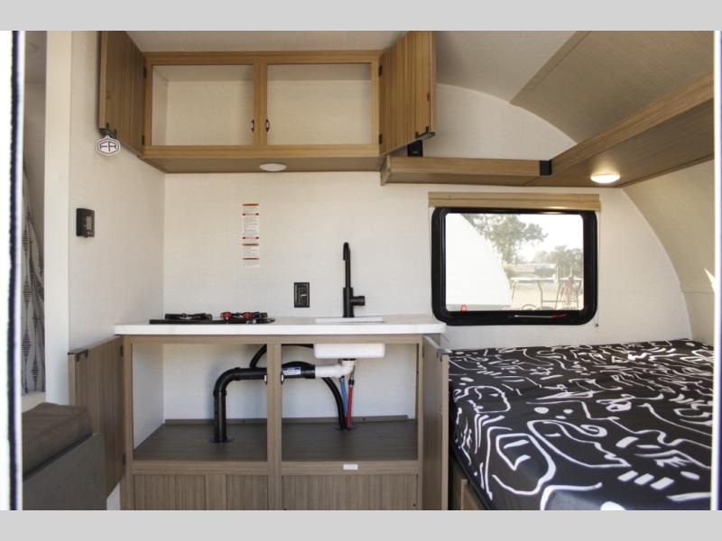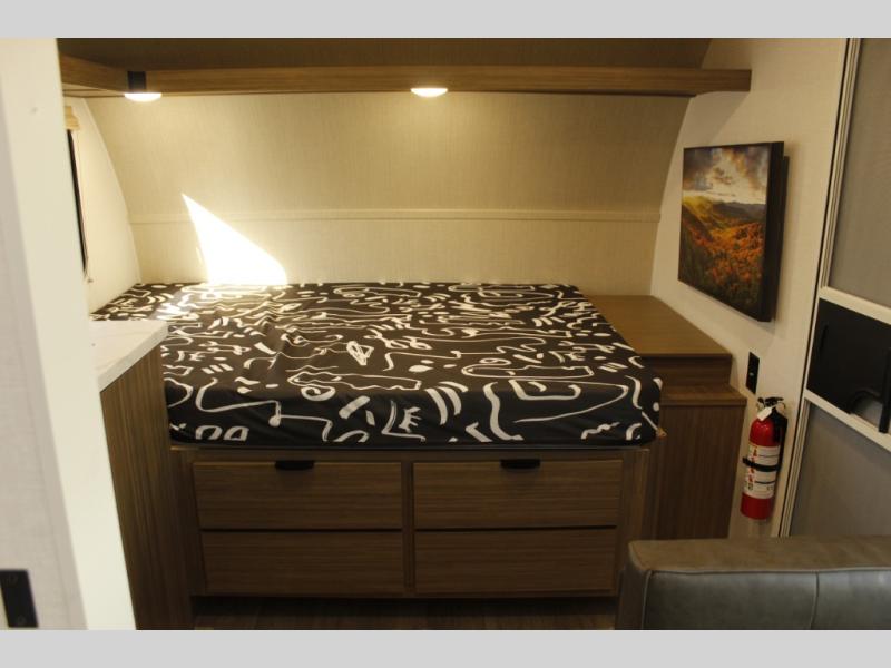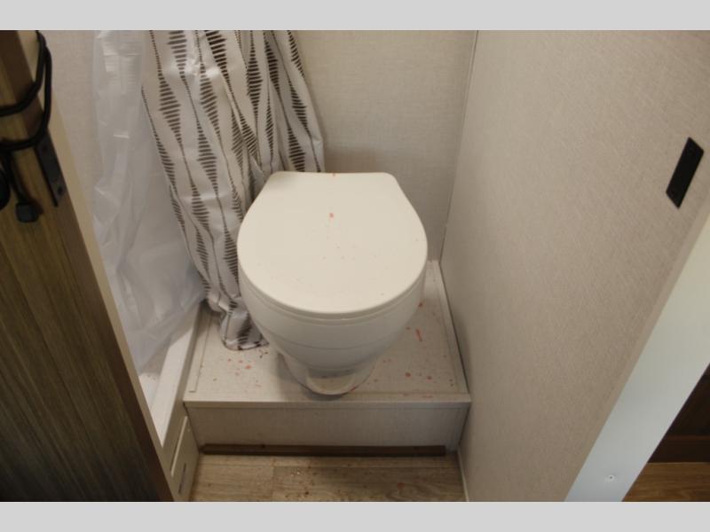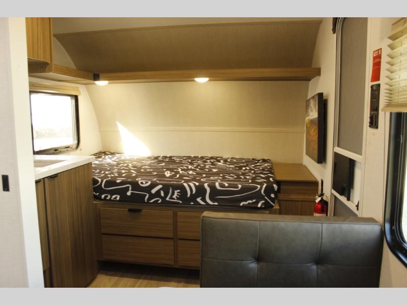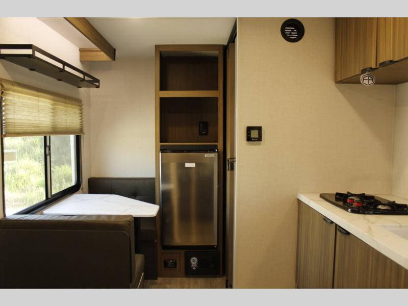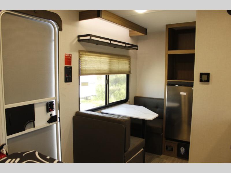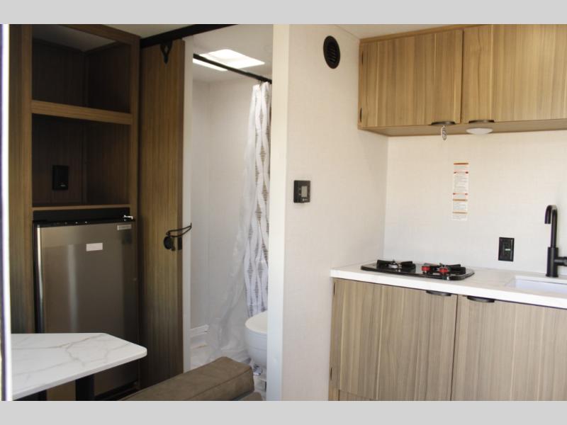 This lightweight travel trailer has everything you need to enjoy camping trips! There is a front east to west custom king bed with storage at the foot of the bed and overhead for your valuables. A private bath includes a toilet and walk-in shower so you can easily get ready each day, and you can prepare your meals on the two-burner cooktop when you get hungry. The booth dinette will provide dining space, along with sleeping space for one to two little ones. Don't let this trailer get away!