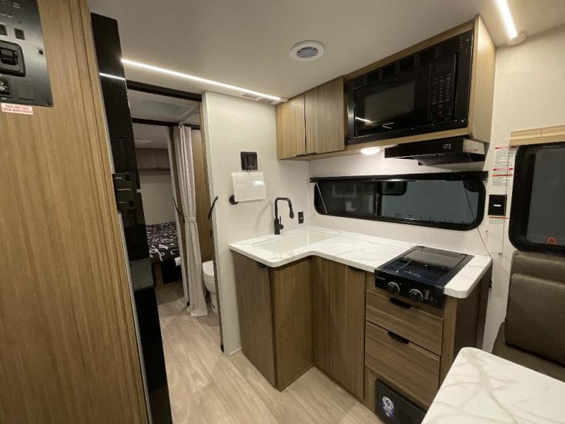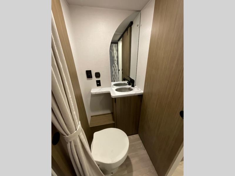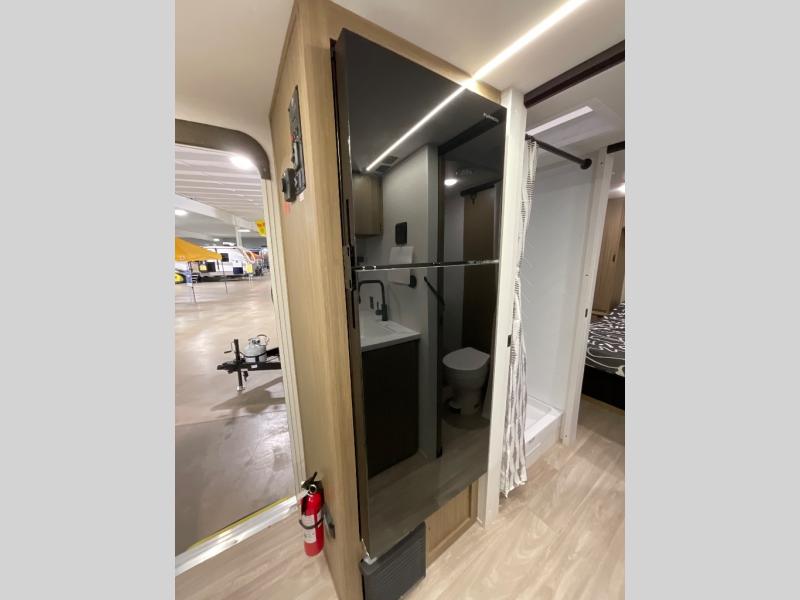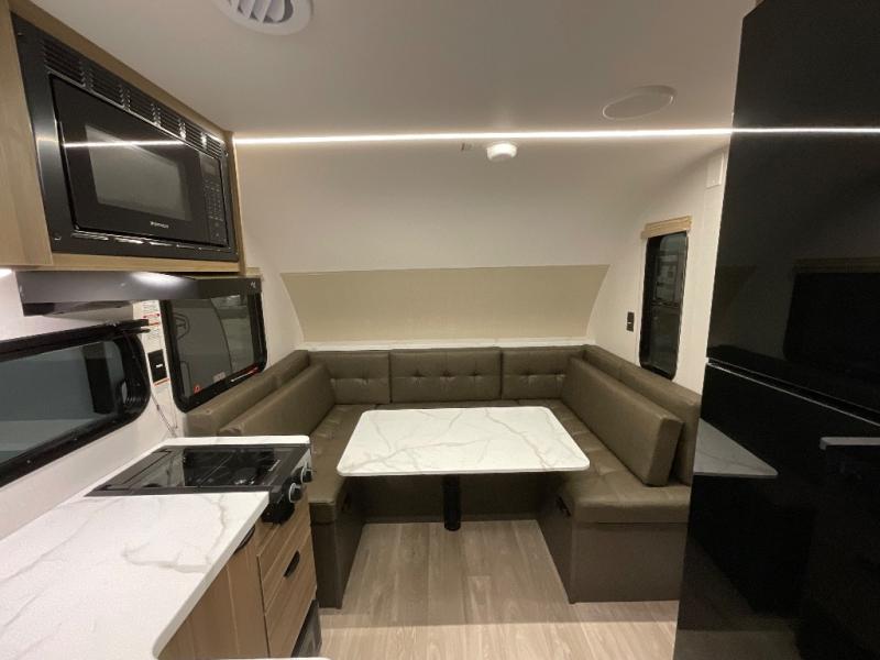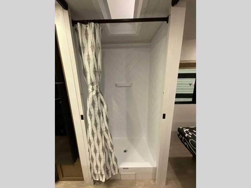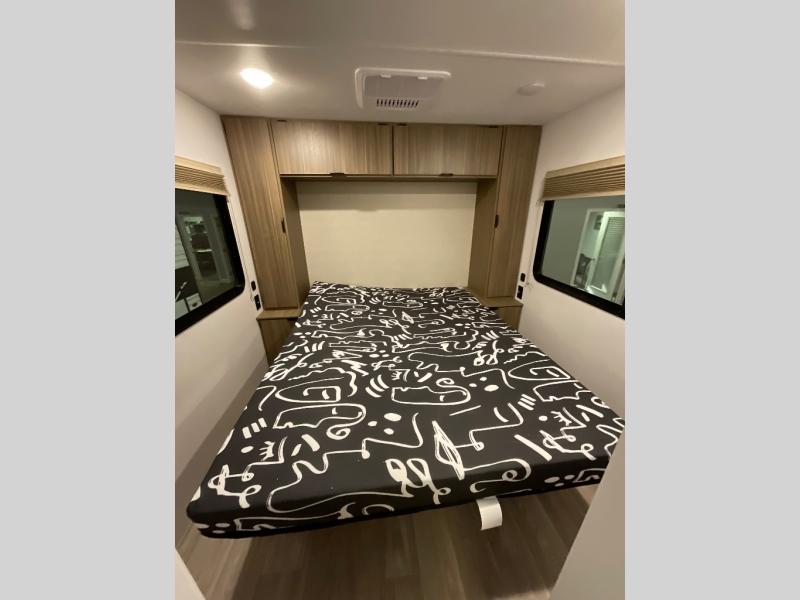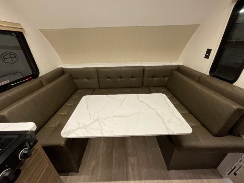 Pack your bags and head to the campground in this cozy travel trailer. Once you arrive you can unload the exterior storage, and there is a 15' power awning with LED lights to enjoy an outdoor living space. The U-shaped dinette inside will be perfect for mealtimes and game night, plus this space can double as additional sleeping space if you have guests. There is a separated bath, with the toilet and sink in one room, and the shower across the hall so two people can freshen up at the same. And don't overlook the rear bedroom with a queen bed, dual wardrobes, plus an overhead cabinet for your things.