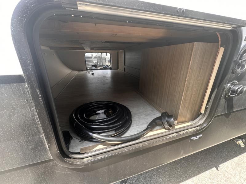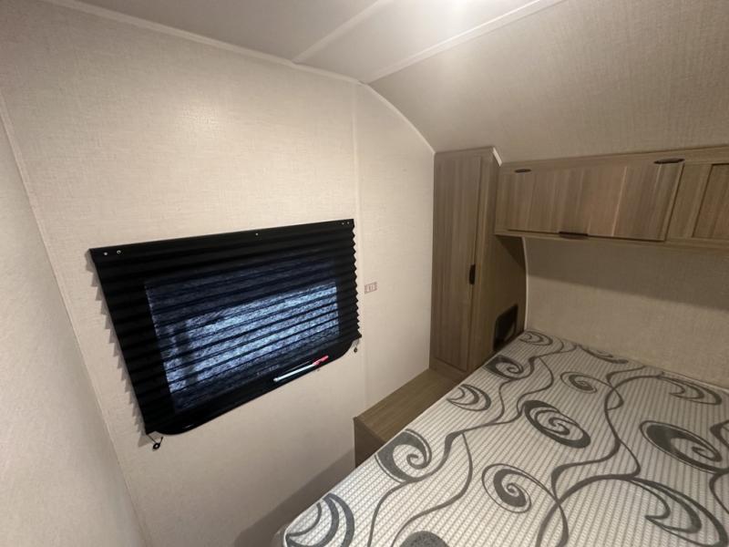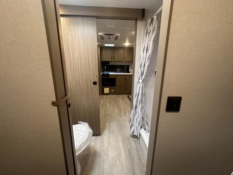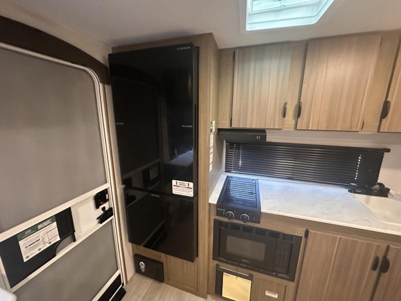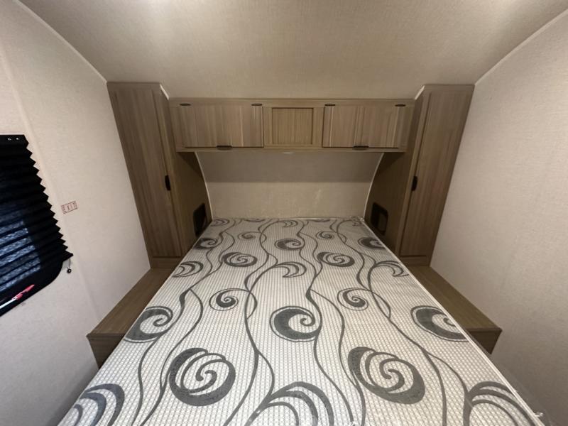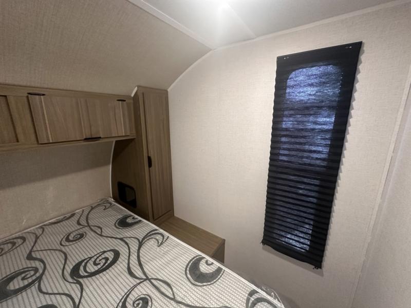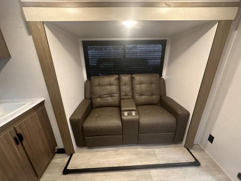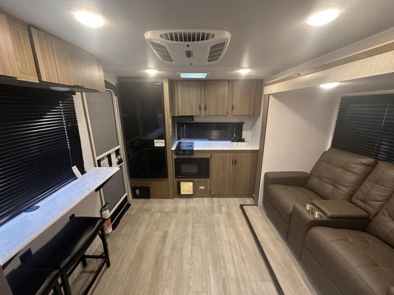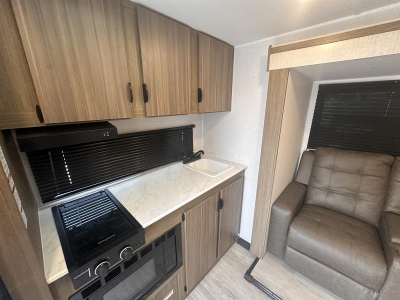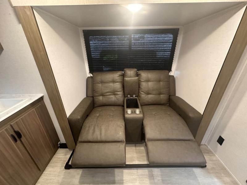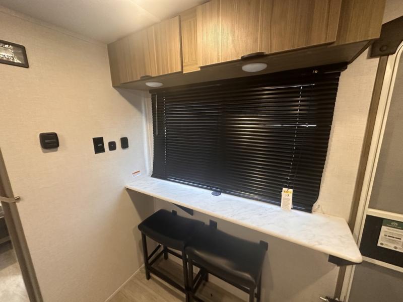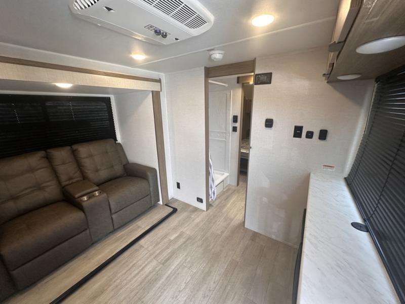 You're going to love every minute spent in this couple's trailer. The queen bed in the front private bedroom will provide a great night's rest, and there are dual wardrobes to easily get dressed in the morning. Head to the kitchen through the bath, then prepare eggs and bacon on the two burner cooktop. There is theater seating here to enjoy your coffee at each morning, or you may want to get some work done at the mobile workstation!