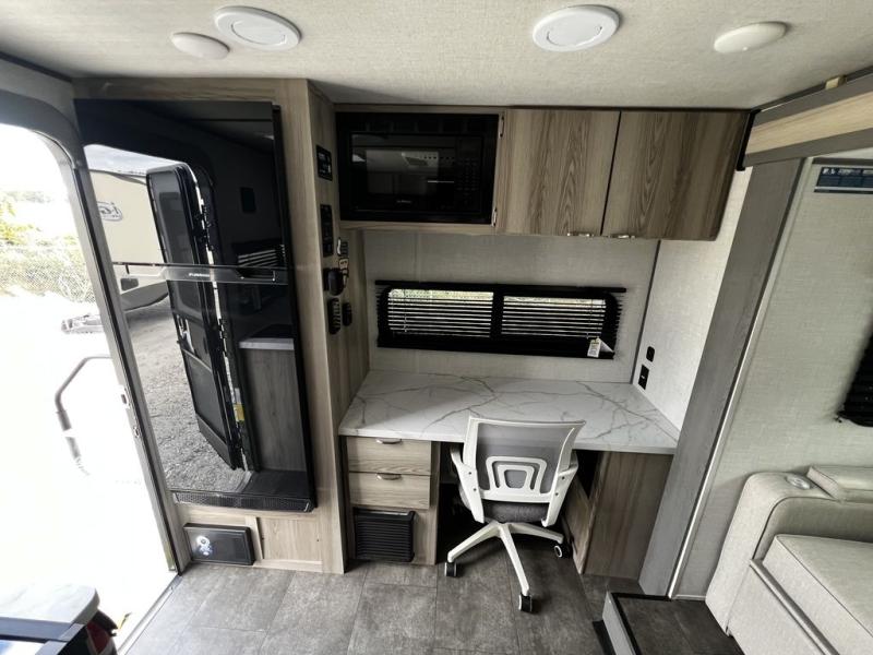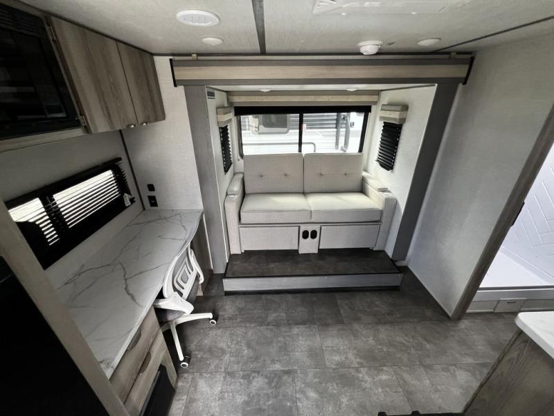 You're going to love every minute spent in this couple's trailer. The queen bed in the front private bedroom will provide a great night's rest, and there are dual wardrobes to easily get dressed in the morning. Head to the kitchen through the bath, then prepare eggs and bacon on the two-burner cooktop. There is a sofa here to enjoy your coffee at each morning, or you may want to get some work done at the mobile workstation!