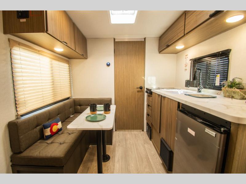 At the rear of the trailer, the full bathroom offers privacy and convenience, making it well suited for longer weekends or extended road trips. The large under-counter refrigerator adds practical cold storage without overwhelming the interior.