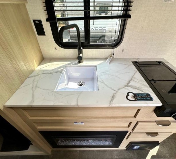 The Forest River Wildwood FSX Limited Edition travel trailer is easy to tow and easy to love, so come take a look! You'll appreciate the aerodynamic front profile, diamond plate front rock guard, and seamless holding tanks. The 26" entry doors are easy to access. Nitrogen filled tires offer a smooth ride, but there's a full-size spare tire if you happen to need it. A dedicated cable TV hookup is located on the exterior, so you can settle in under the power awning and watch some TV.