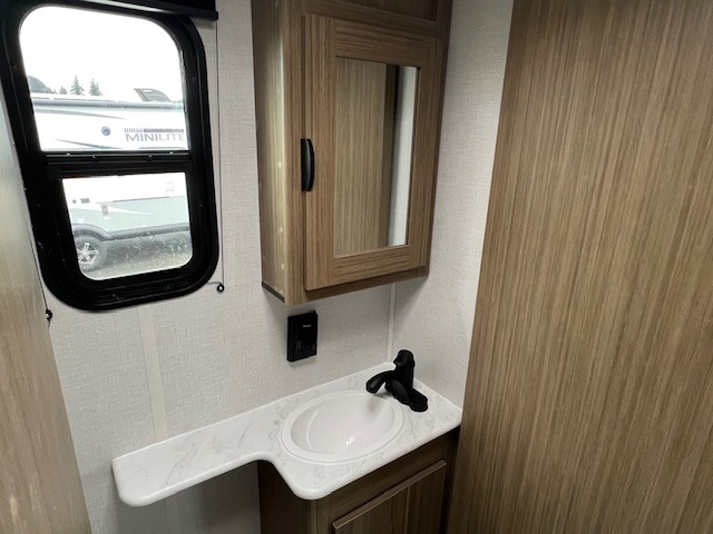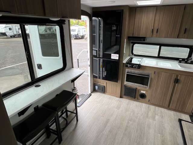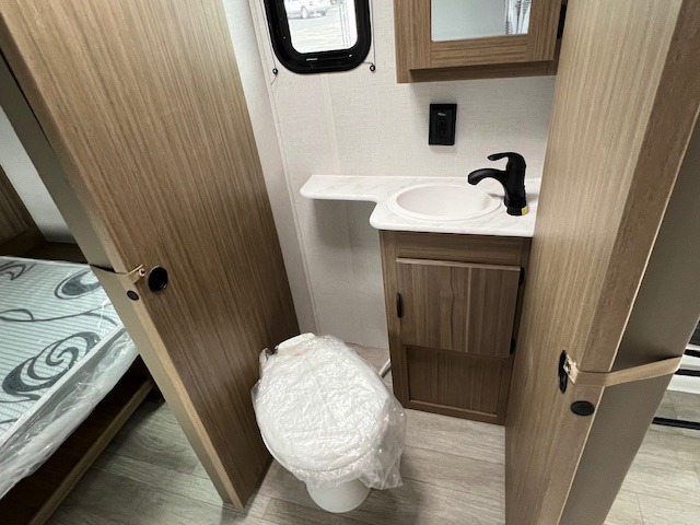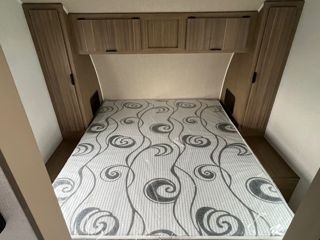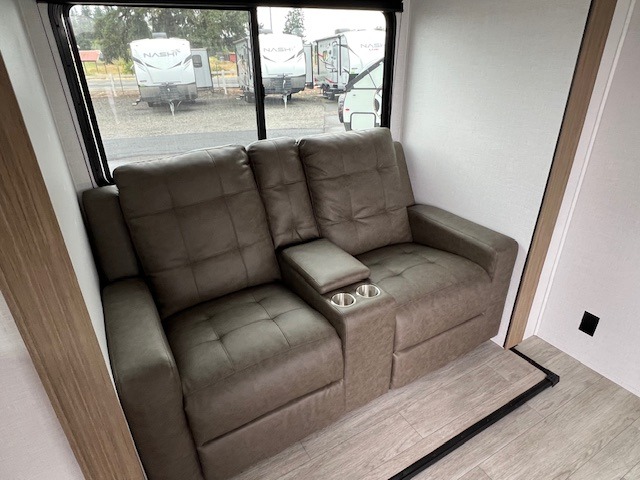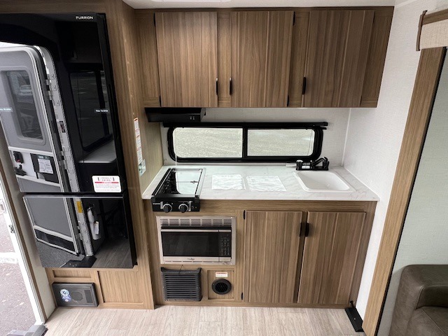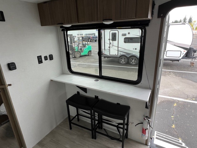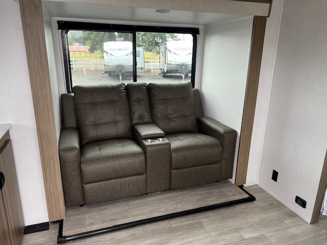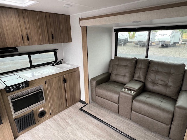 You're going to love every minute spent in this couple's trailer. The queen bed in the front private bedroom will provide a great night's rest, and there are dual wardrobes to easily get dressed in the morning. Head to the kitchen through the bath, then prepare eggs and bacon on the two burner cooktop. There is theater seating here to enjoy your coffee at each morning, or you may want to get some work done at the mobile workstation!