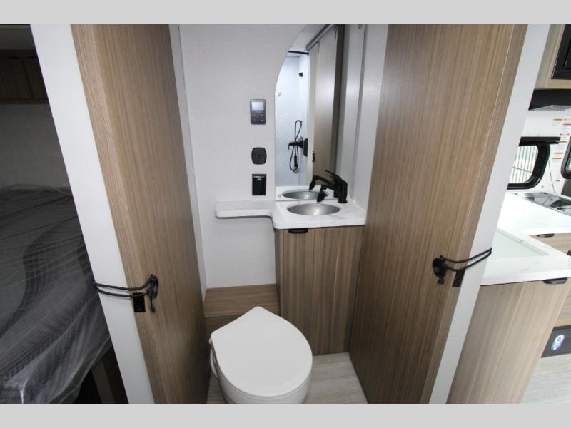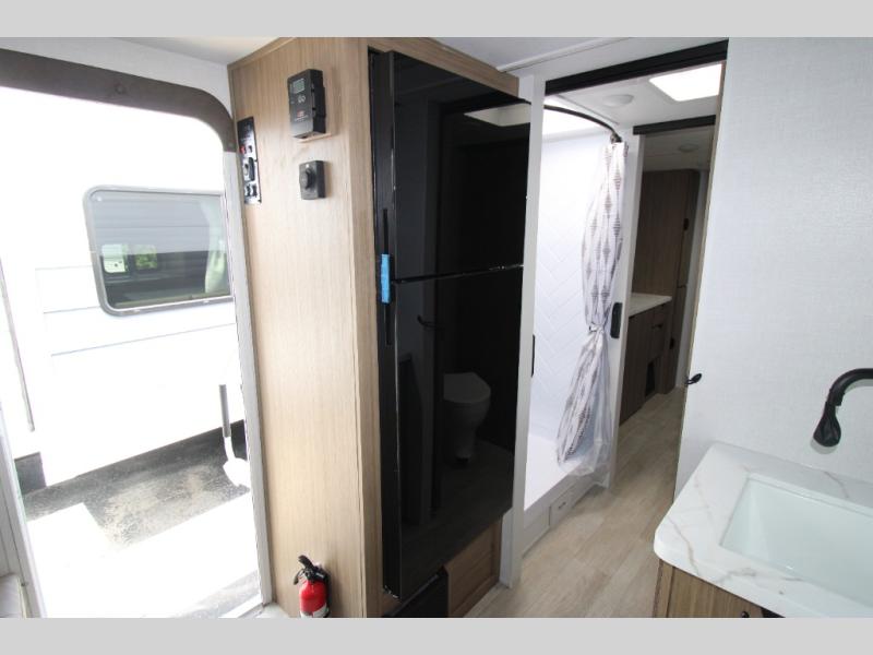 Adventure starts with this travel trailer in tow. Once you arrive at the campground, set up the 15' power awning with LED lights and fill the dog's water bowl using the hot/cold outside shower. Head inside to prepare lunch on the two burner cooktop, and you can dine together around the U-shaped dinette. This area can become your guests' sleeping space at night, while you enjoy the queen bed in the rear bedroom. There is a private toilet and sink, with the private shower right across the hall so two people can get ready for bed at the same time; how convenient!