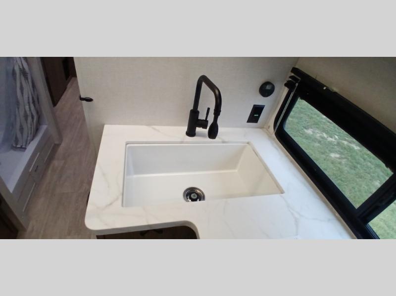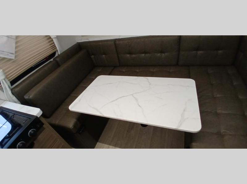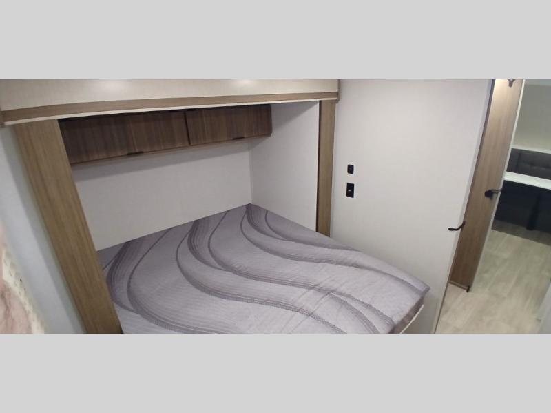 Adventure starts with this travel trailer in tow. Once you arrive at the campground, set up the 15' power awning with LED lights and fill the dog's water bowl using the hot/cold outside shower. Head inside to prepare lunch on the two burner cooktop, and you can dine together around the U-shaped dinette. This area can become your guests' sleeping space at night, while you enjoy the queen bed in the rear bedroom. There is a private toilet and sink, with the private shower right across the hall so two people can get ready for bed at the same time; how convenient!