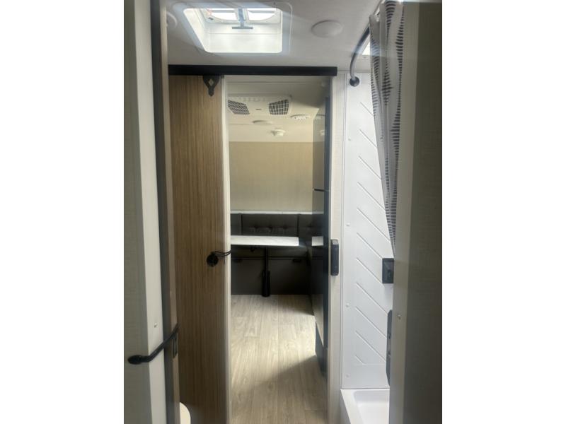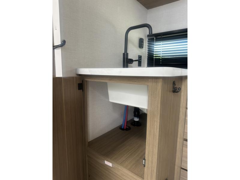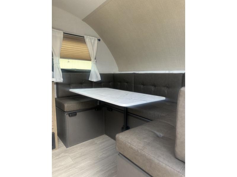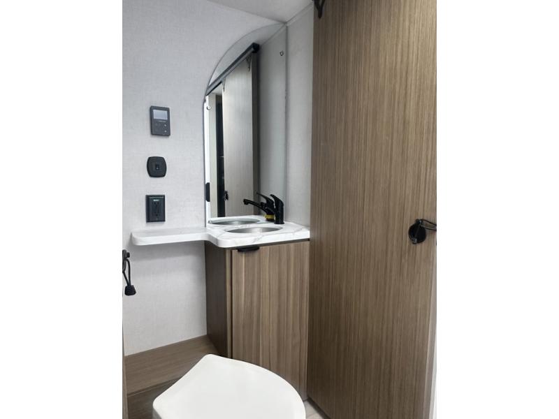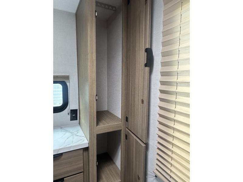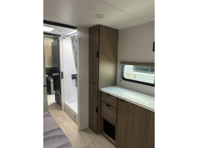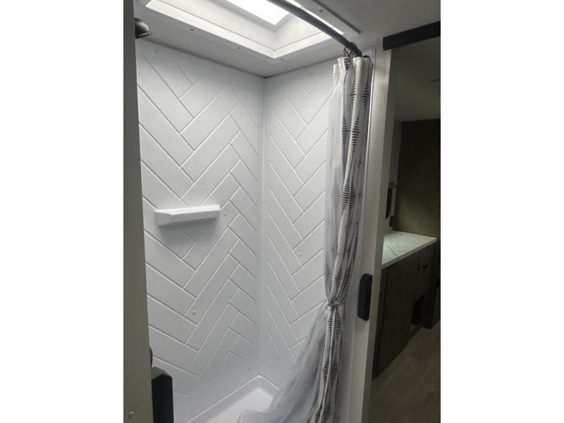 Adventure starts with this travel trailer in tow. Once you arrive at the campground, set up the 15' power awning with LED lights and fill the dog's water bowl using the hot/cold outside shower. Head inside to prepare lunch on the two burner cooktop, and you can dine together around the U-shaped dinette. This area can become your guests' sleeping space at night, while you enjoy the queen bed in the rear bedroom. There is a private toilet and sink, with the private shower right across the hall so two people can get ready for bed at the same time; how convenient!