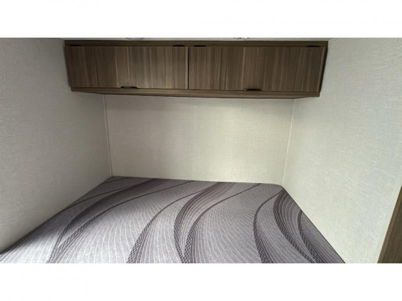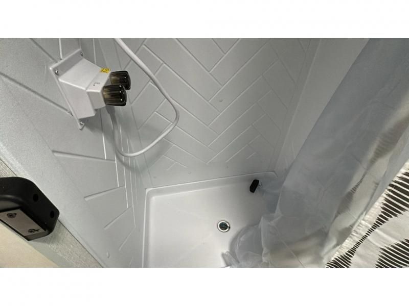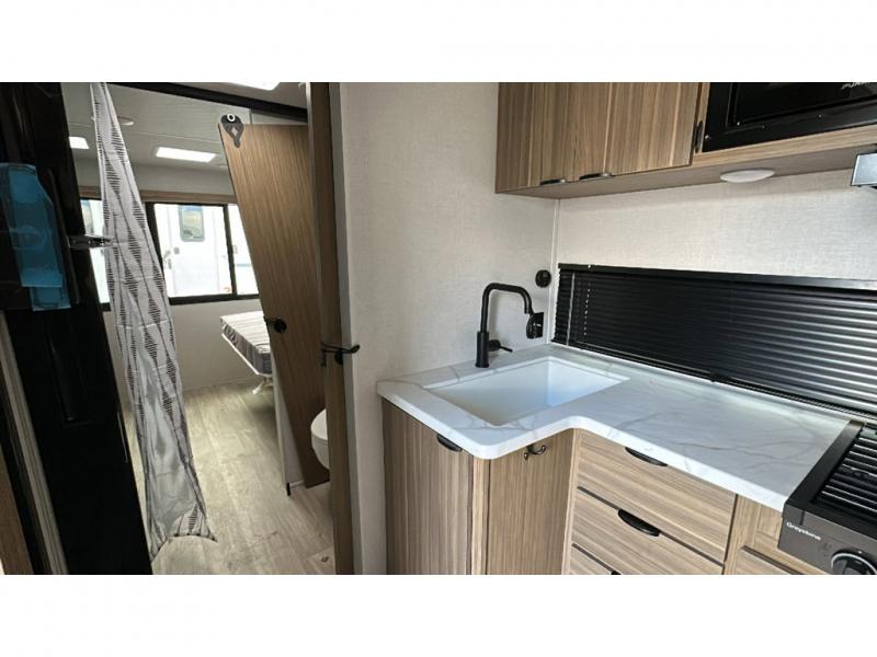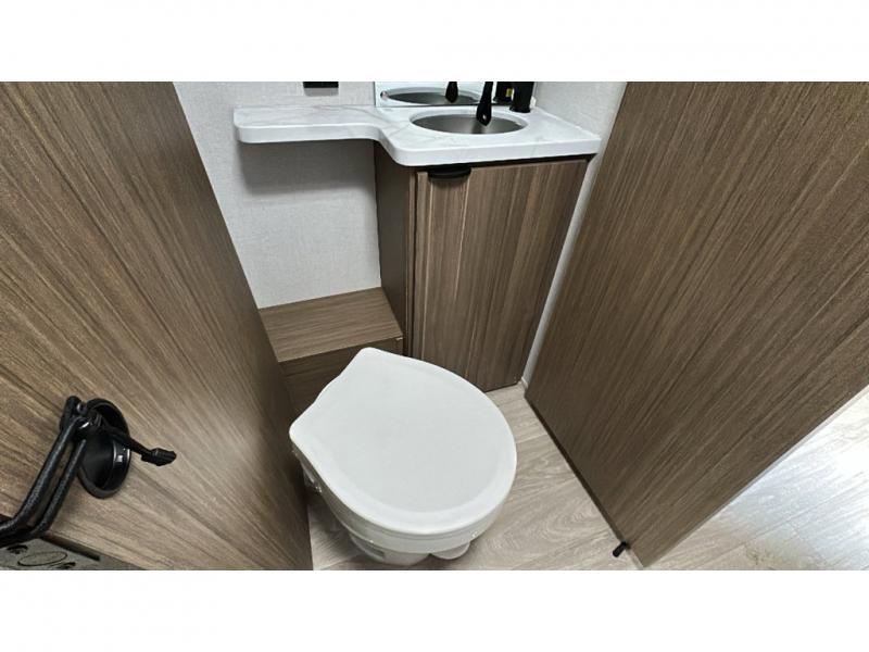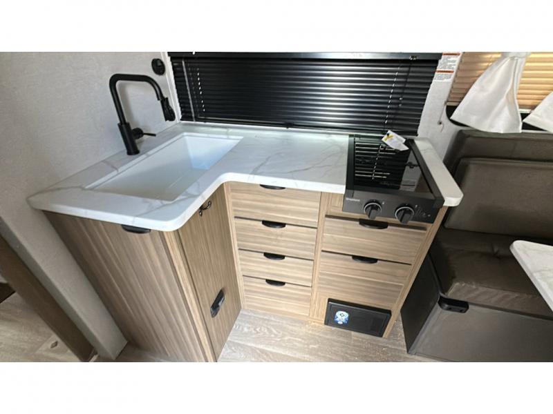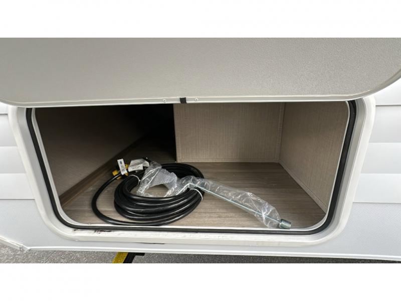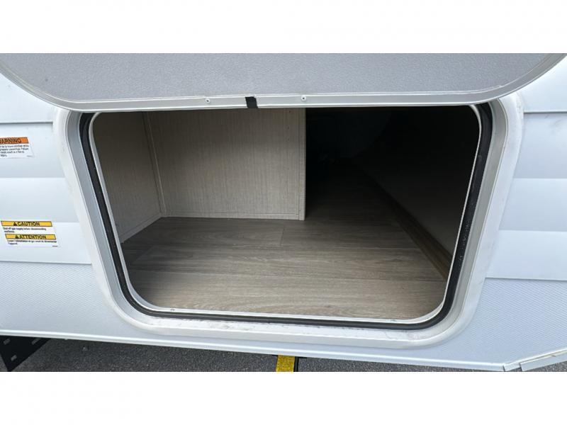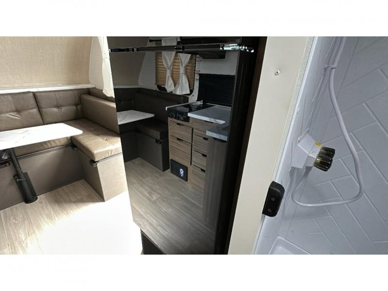 Adventure starts with this travel trailer in tow. Once you arrive at the campground, set up the 15' power awning with LED lights and fill the dog's water bowl using the hot/cold outside shower. Head inside to prepare lunch on the two-burner cooktop, and you can dine together around the U-shaped dinette. This area can become your guests' sleeping space at night, while you enjoy the queen bed in the rear bedroom. There is a private toilet and sink, with the private shower right across the hall so two people can get ready for bed at the same time: how convenient!
