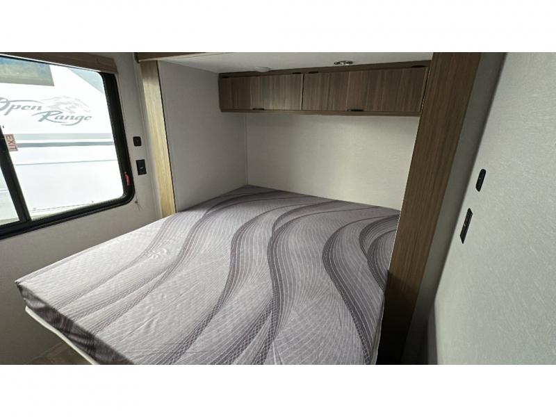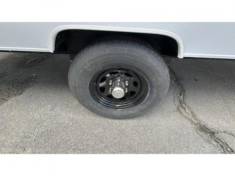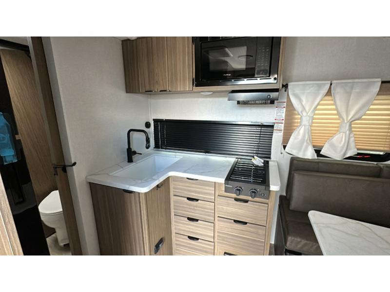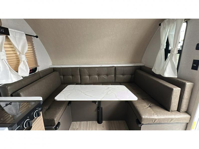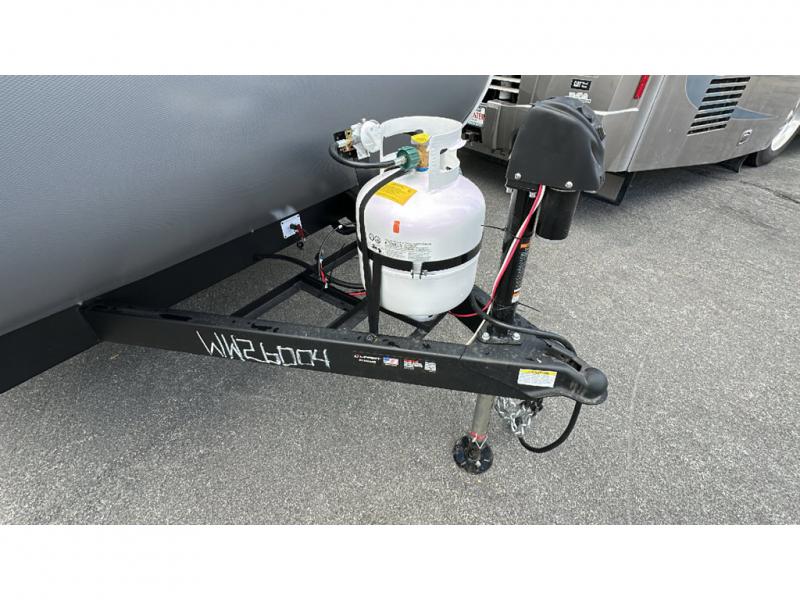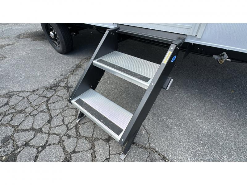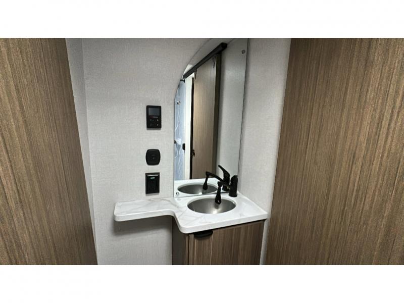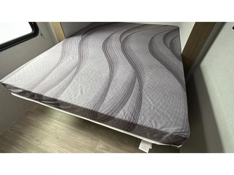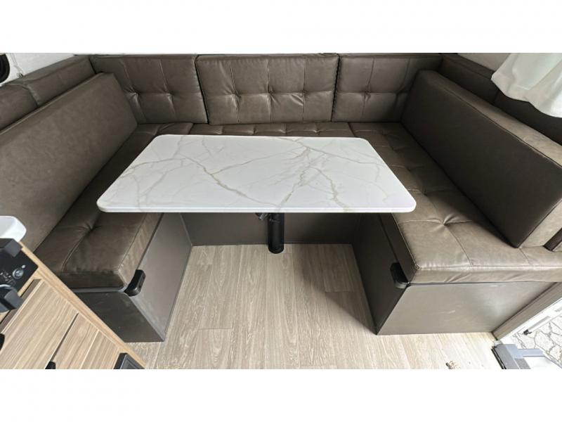 Adventure starts with this travel trailer in tow. Once you arrive at the campground, set up the 15' power awning with LED lights and fill the dog's water bowl using the hot/cold outside shower. Head inside to prepare lunch on the two-burner cooktop, and you can dine together around the U-shaped dinette. This area can become your guests' sleeping space at night, while you enjoy the queen bed in the rear bedroom. There is a private toilet and sink, with the private shower right across the hall so two people can get ready for bed at the same time: how convenient!