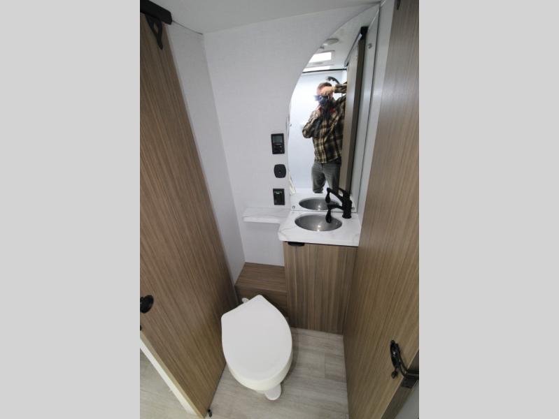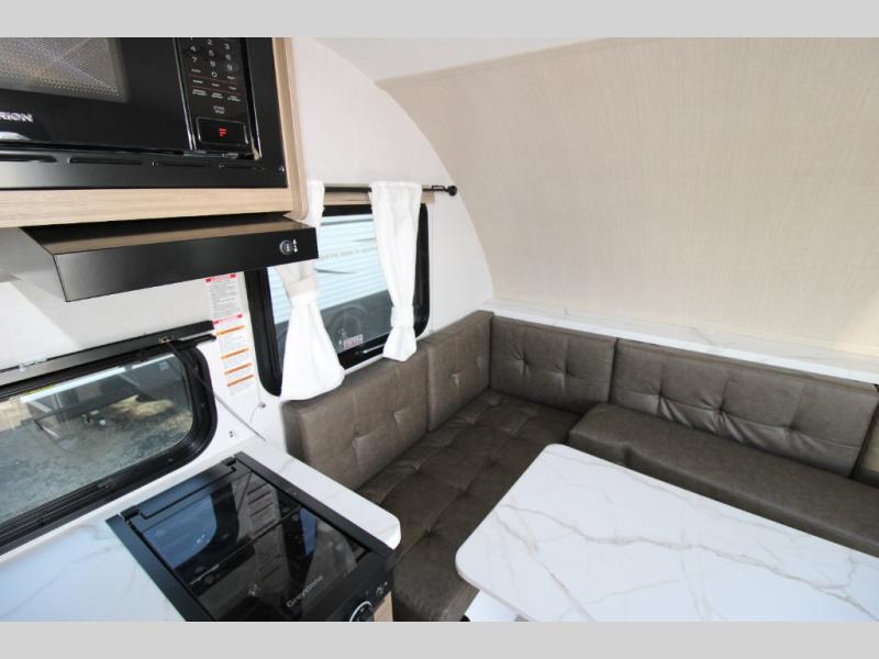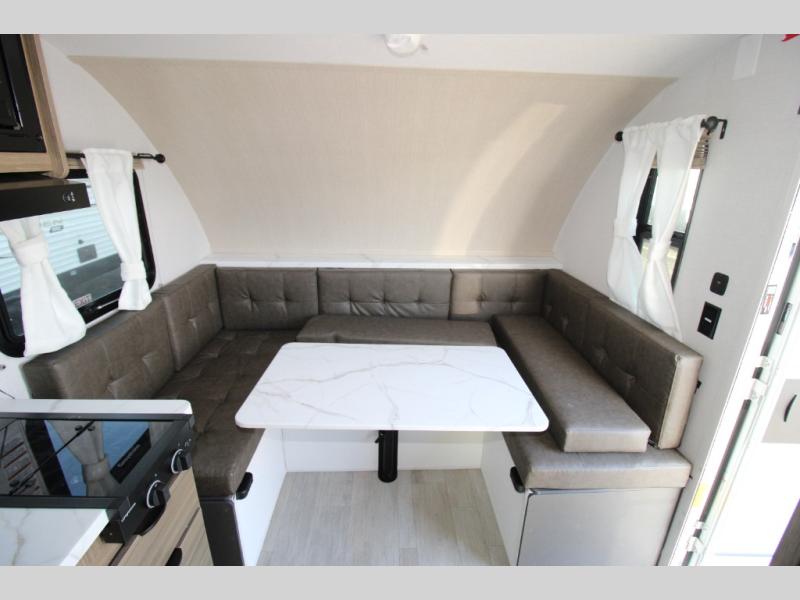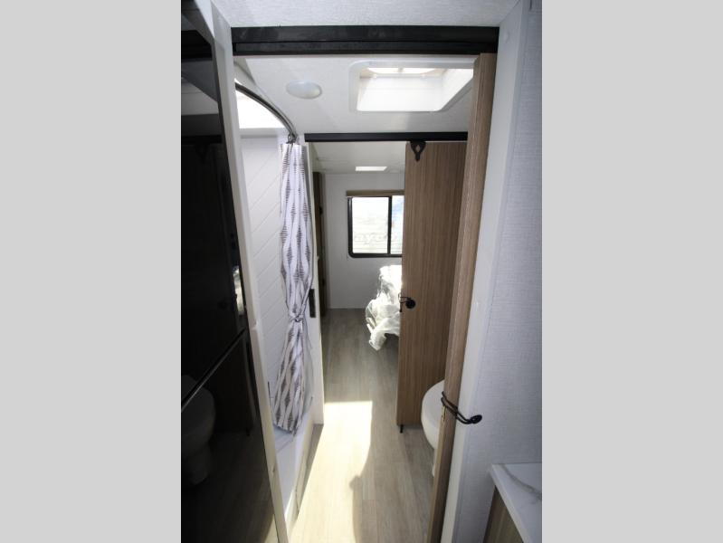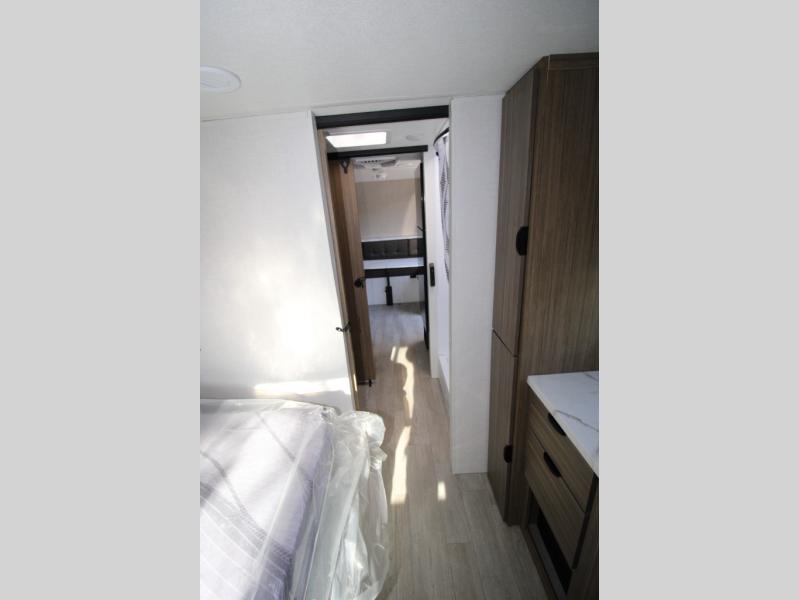 Adventure starts with this travel trailer in tow. Once you arrive at the campground, set up the 15' power awning with LED lights and fill the dog's water bowl using the hot/cold outside shower. Head inside to prepare lunch on the two-burner cooktop, and you can dine together around the U-shaped dinette. This area can become your guests' sleeping space at night, while you enjoy the queen bed in the rear bedroom. There is a private toilet and sink, with the private shower right across the hall so two people can get ready for bed at the same time: how convenient!
