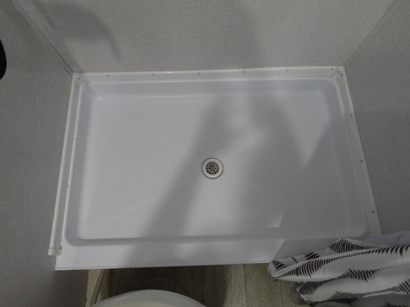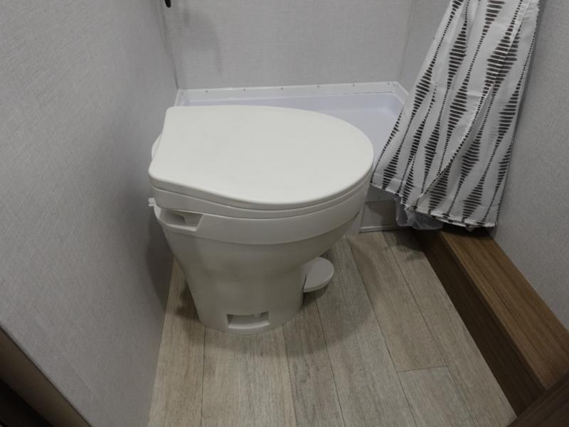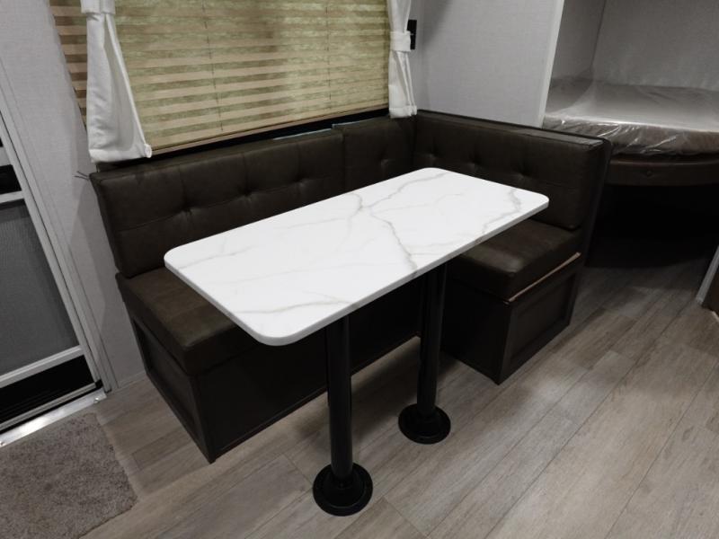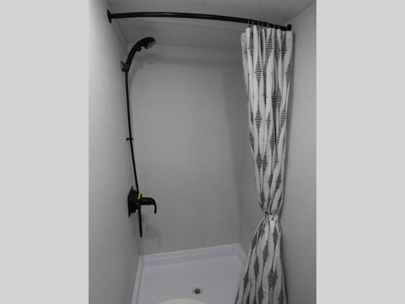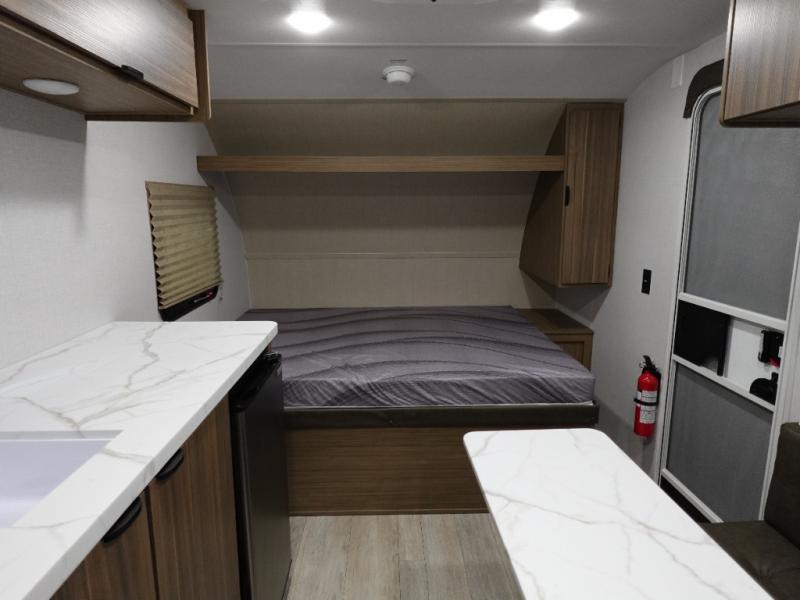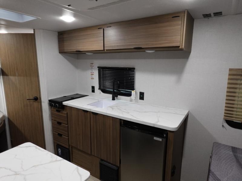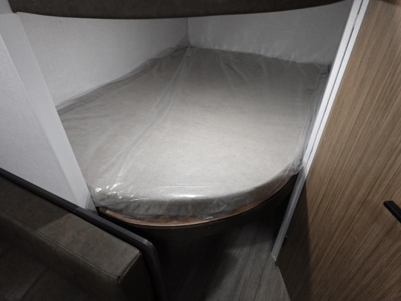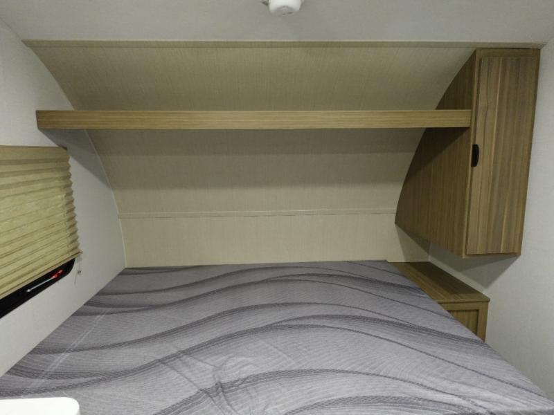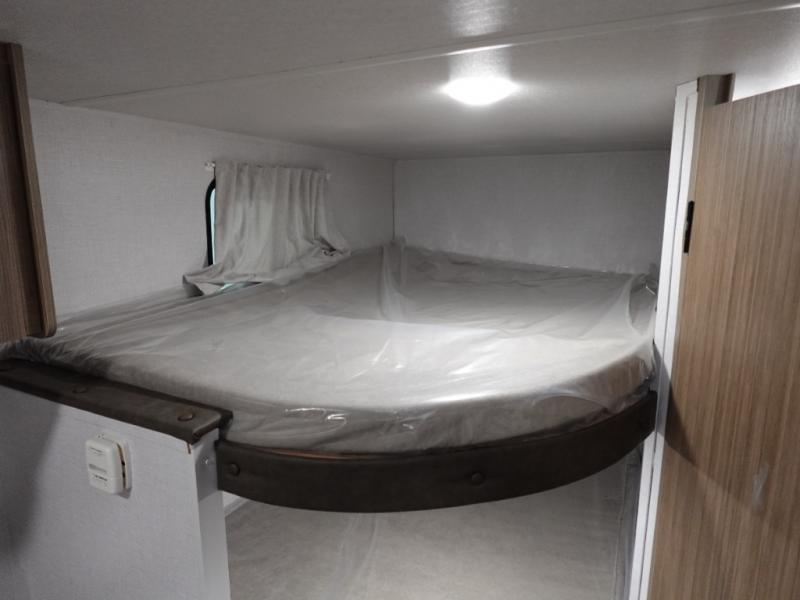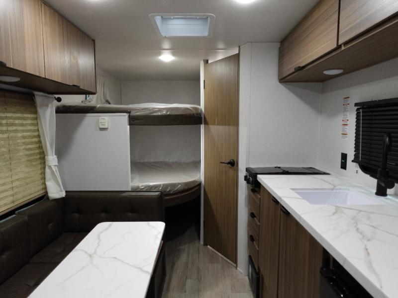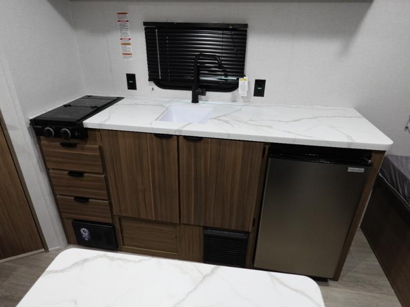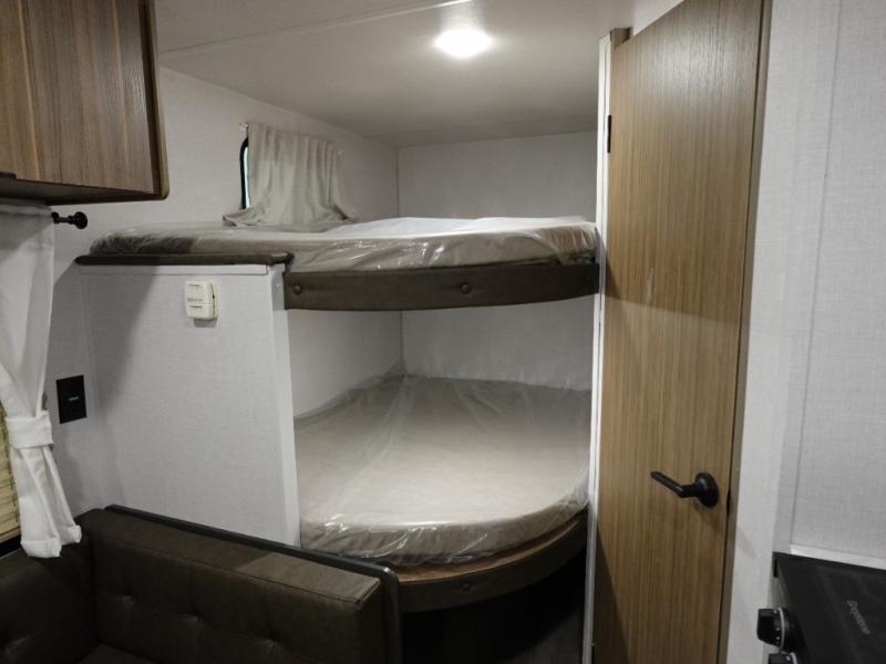 The double-size bunks with storage will be a big selling point in this travel trailer! While your guests take the bunks, you can have the front queen bed all to yourselves, and there is a wardrobe to keep your things organized. A two burner cooktop and microwave will let you make meals each day, and you can dine at the open lounge with a table.