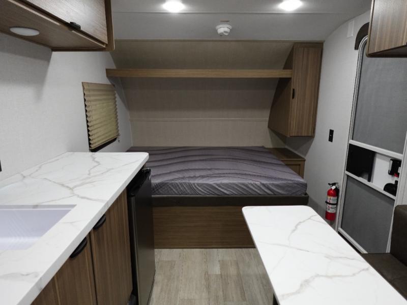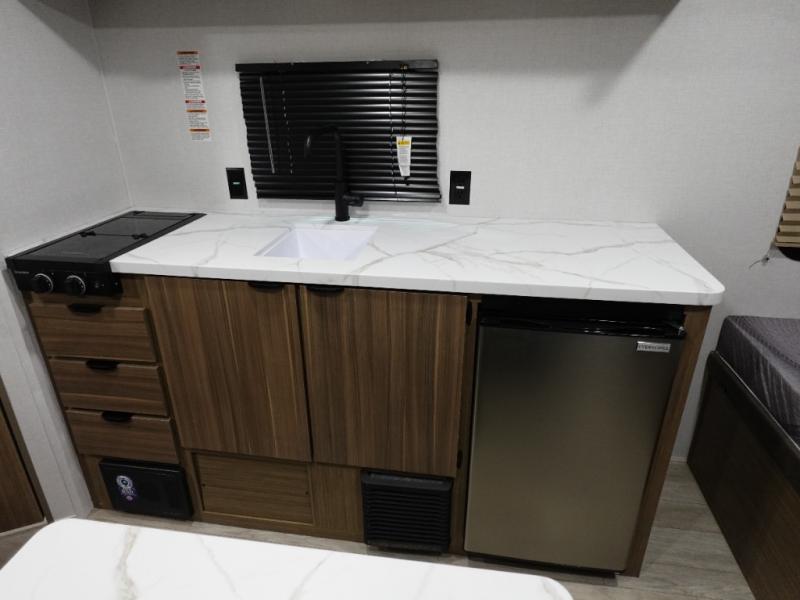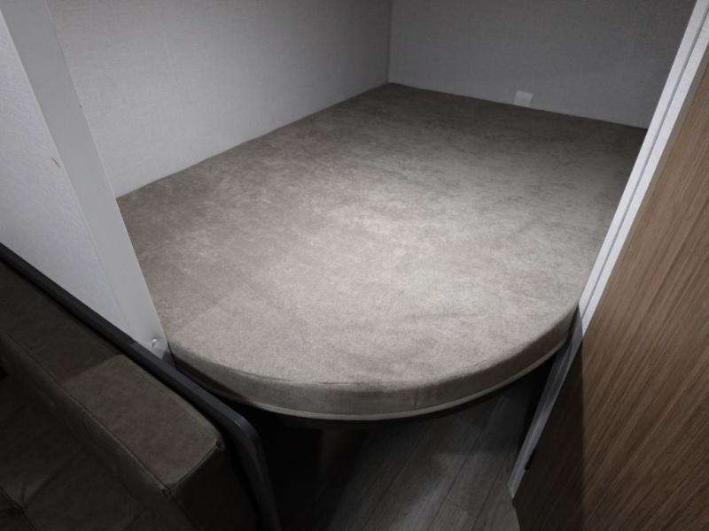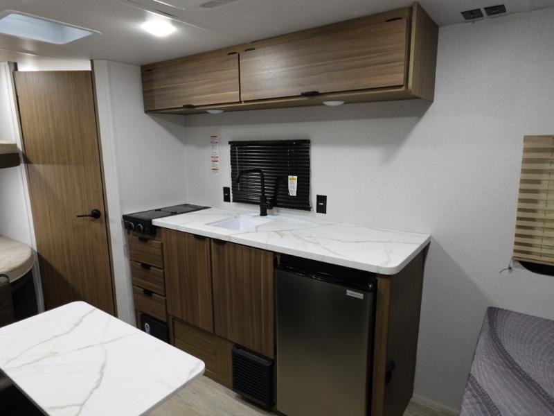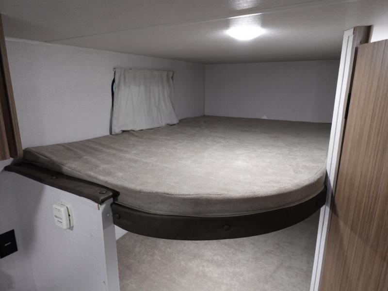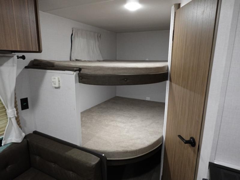 The double-size bunks with storage will be a big selling point in this travel trailer! While your guests take the bunks, you can have the front queen bed all to yourselves, and there is a wardrobe to keep your things organized. A two burner cooktop and microwave will let you make meals each day, and you can dine at the open lounge with a table.