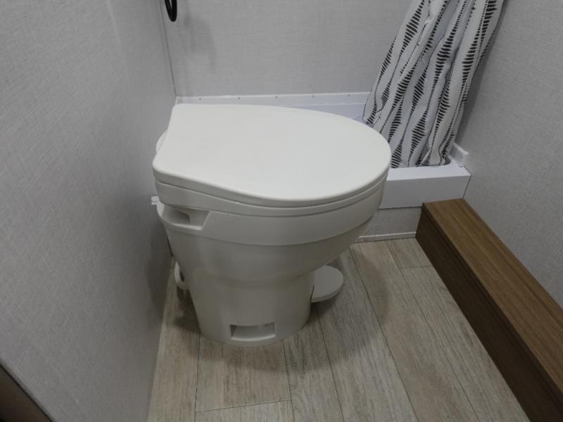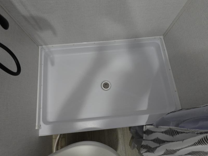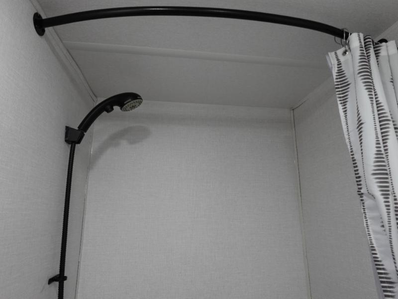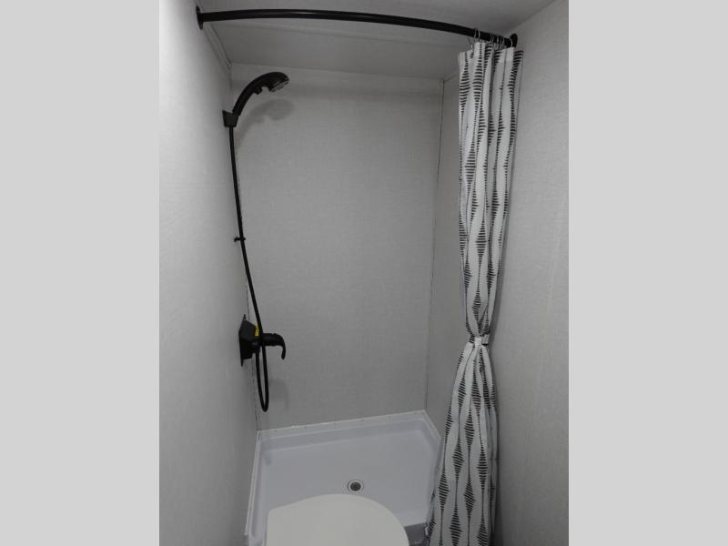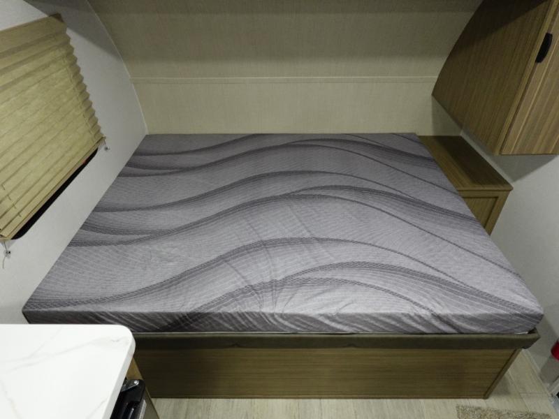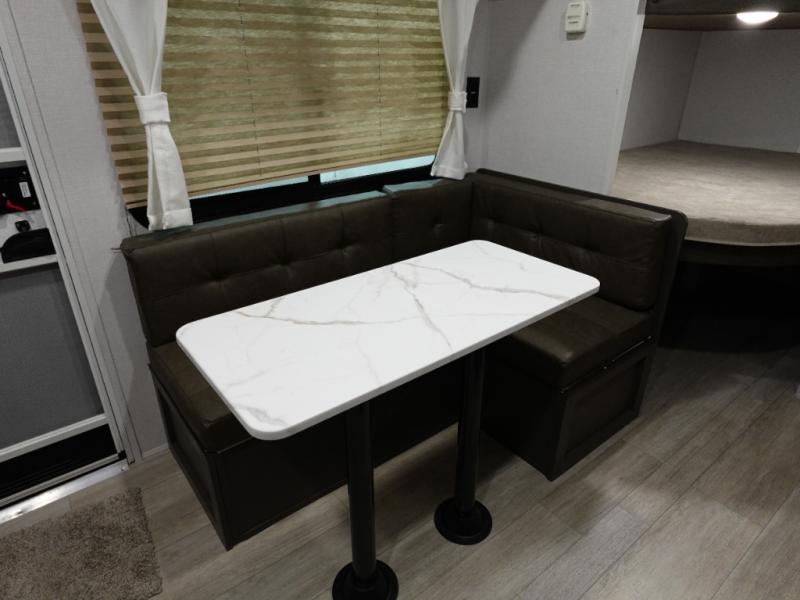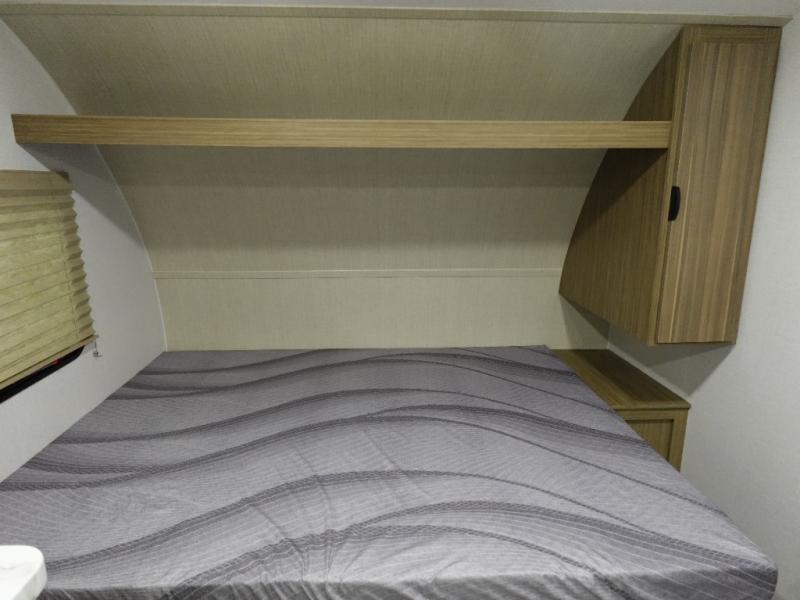 The double-size bunks with storage will be a big selling point in this travel trailer! While your guests take the bunks, you can have the front queen bed all to yourselves, and there is a wardrobe to keep your things organized. A two burner cooktop and microwave will let you make meals each day, and you can dine at the open lounge with a table.