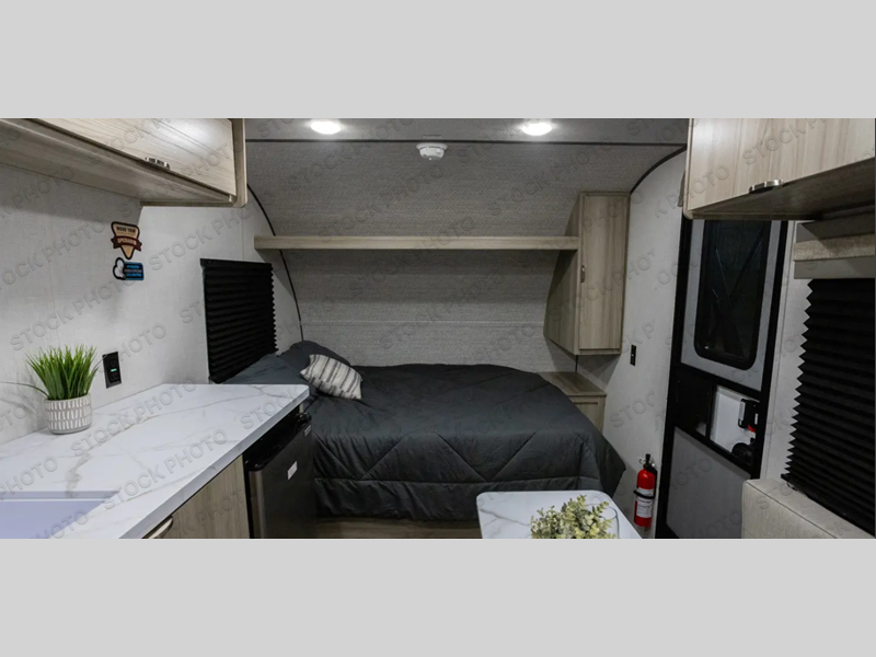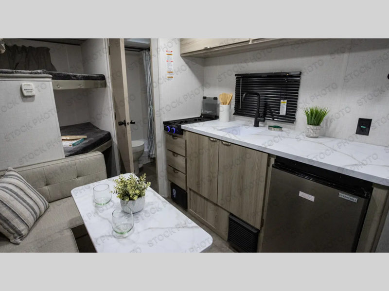 The double-size bunks with storage will be a big selling point in this travel trailer! While your guests take the bunks, you can have the front queen bed all to yourselves, and there is a wardrobe to keep your things organized. A two burner cooktop and microwave will let you make meals each day, and you can dine at the open lounge with a table.