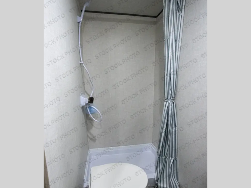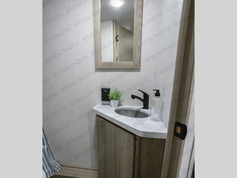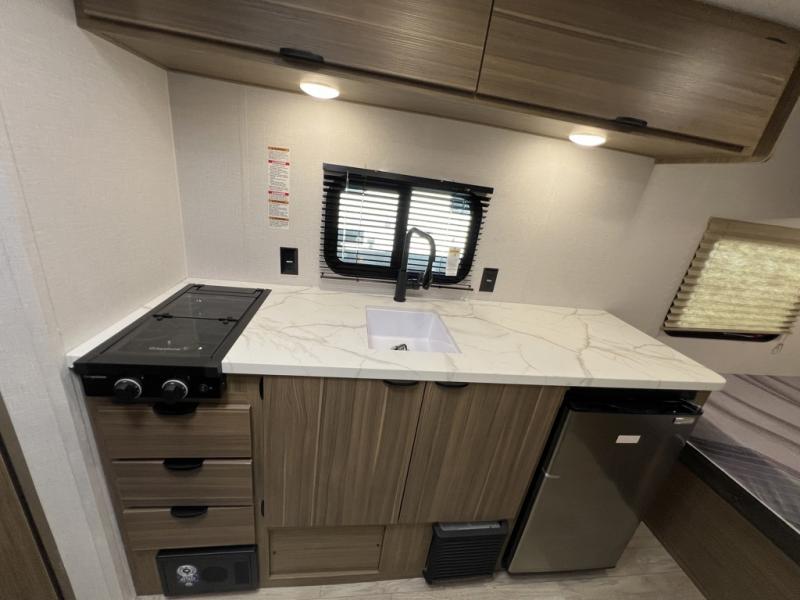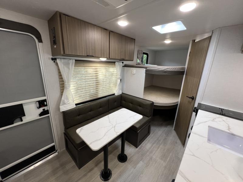 The double-size bunks with storage will be a big selling point in this travel trailer! While your guests take the bunks, you can have the front queen bed all to yourselves, and there is a wardrobe to keep your things organized. A two burner cooktop and microwave will let you make meals each day, and you can dine at the open lounge with a table.
