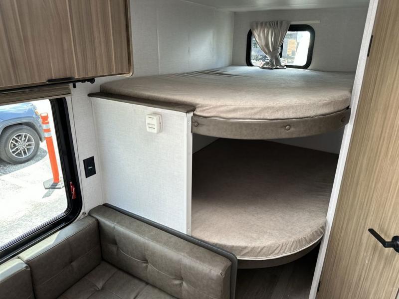 The double-size bunks with storage will be a big selling point in this travel trailer! While your guests take the bunks, you can have the front queen bed all to yourselves, and there is a wardrobe to keep your things organized. A two burner cooktop and microwave will let you make meals each day, and you can dine at the open lounge with a table.