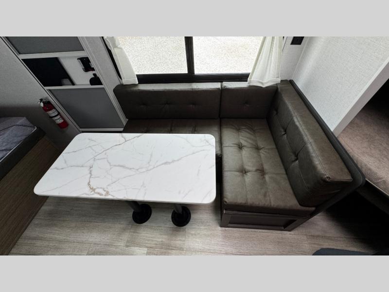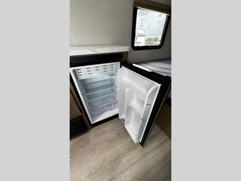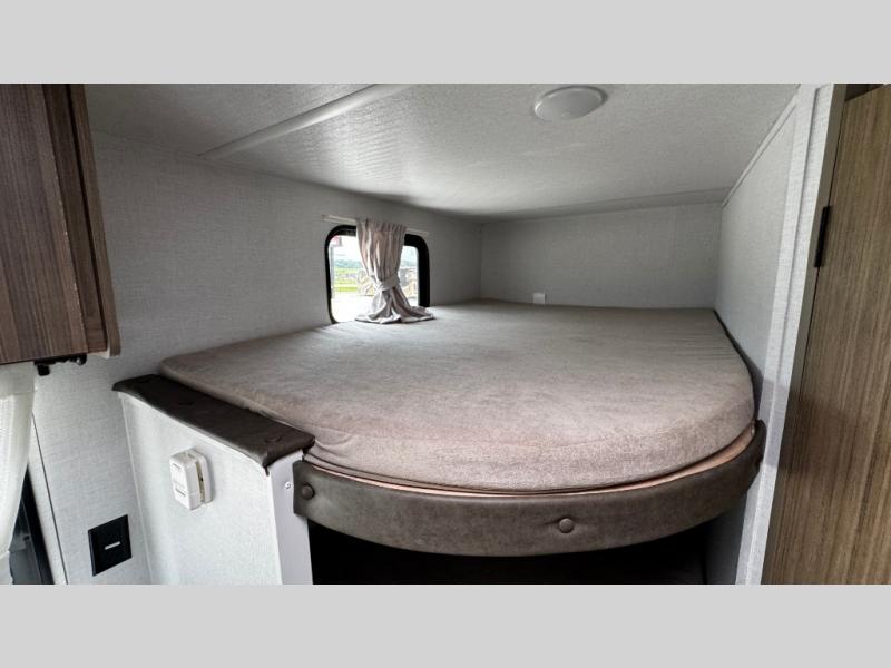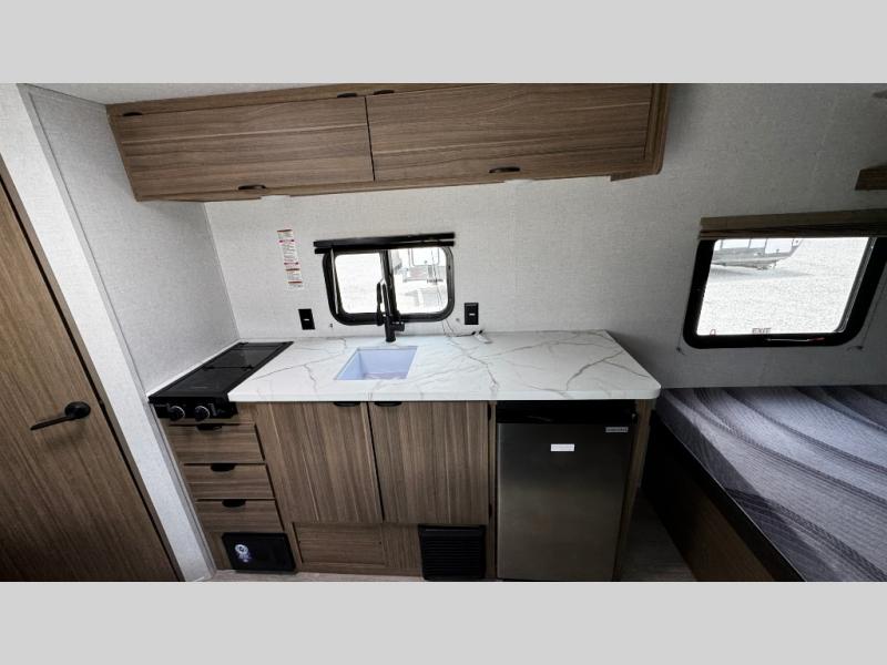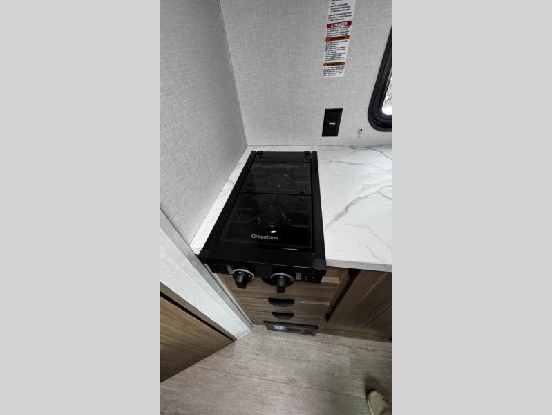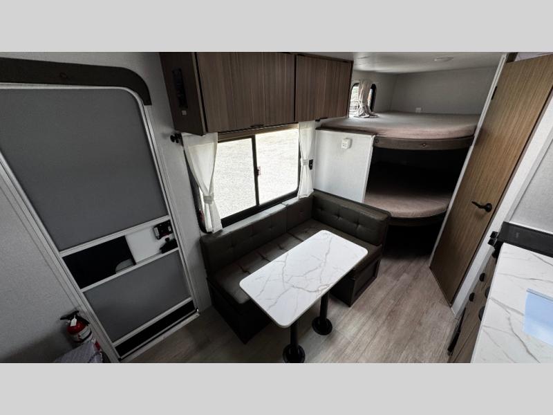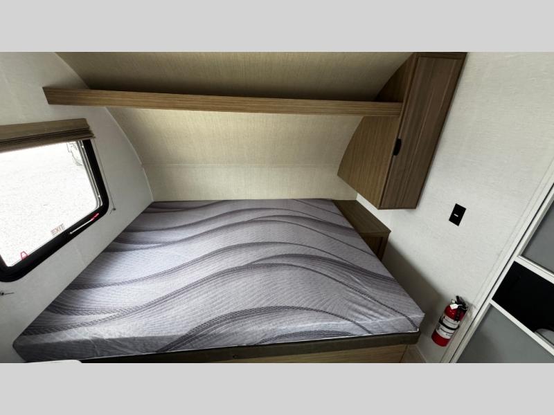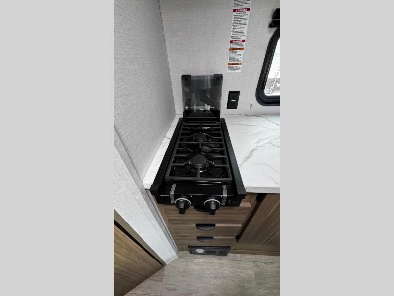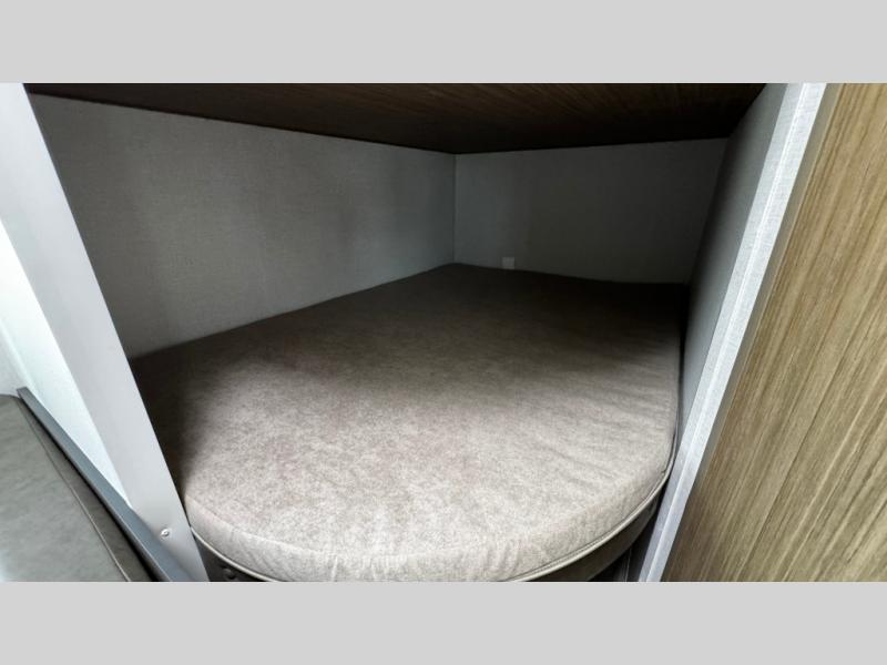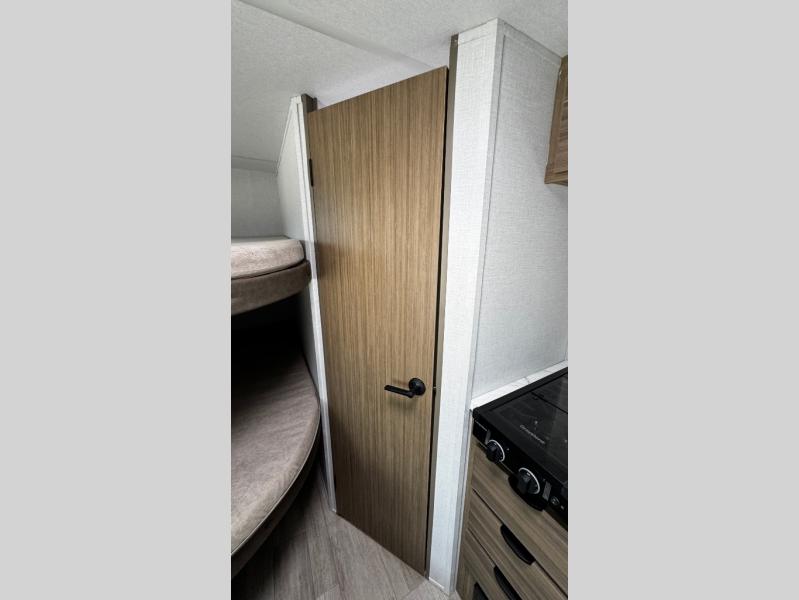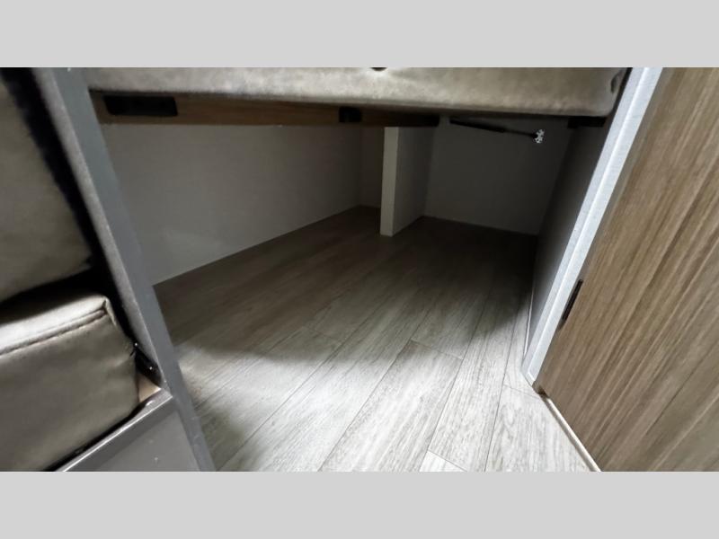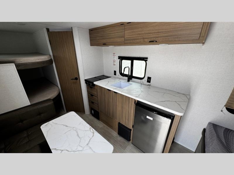 The double-size bunks with storage will be a big selling point in this travel trailer! While your guests take the bunks, you can have the front queen bed all to yourselves, and there is a wardrobe to keep your things organized. A two burner cooktop and microwave will let you make meals each day, and you can dine at the open lounge with a table.