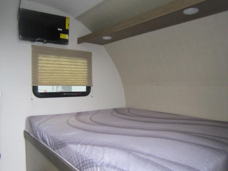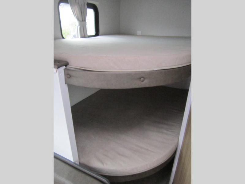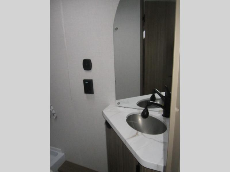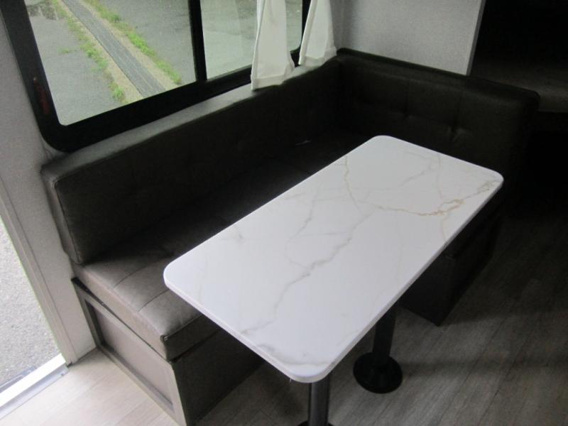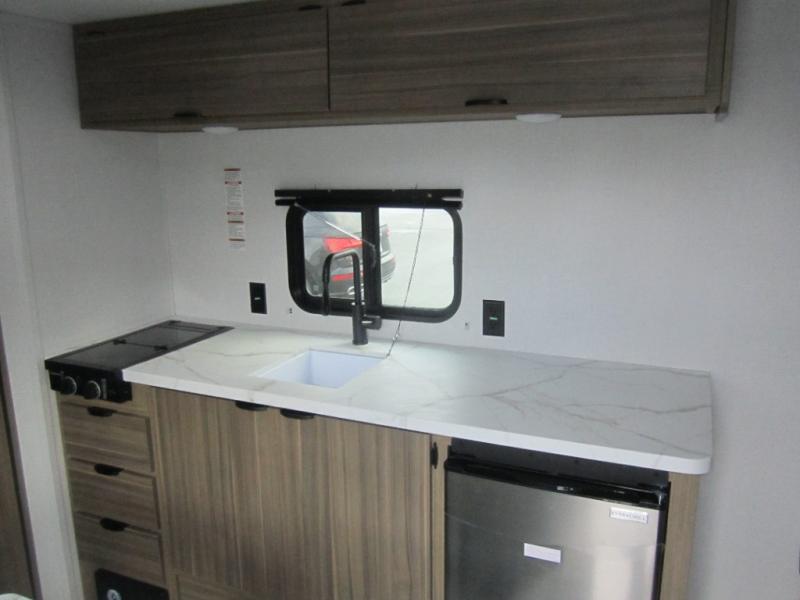 The double-size bunks with storage will be a big selling point in this travel trailer! While your guests take the bunks, you can have the front queen bed all to yourselves, and there is a wardrobe to keep your things organized. A two burner cooktop and microwave will let you make meals each day, and you can dine at the open lounge with a table.