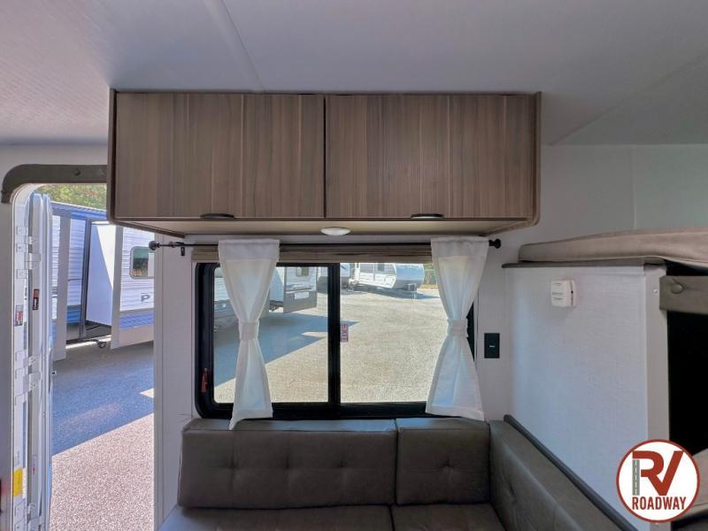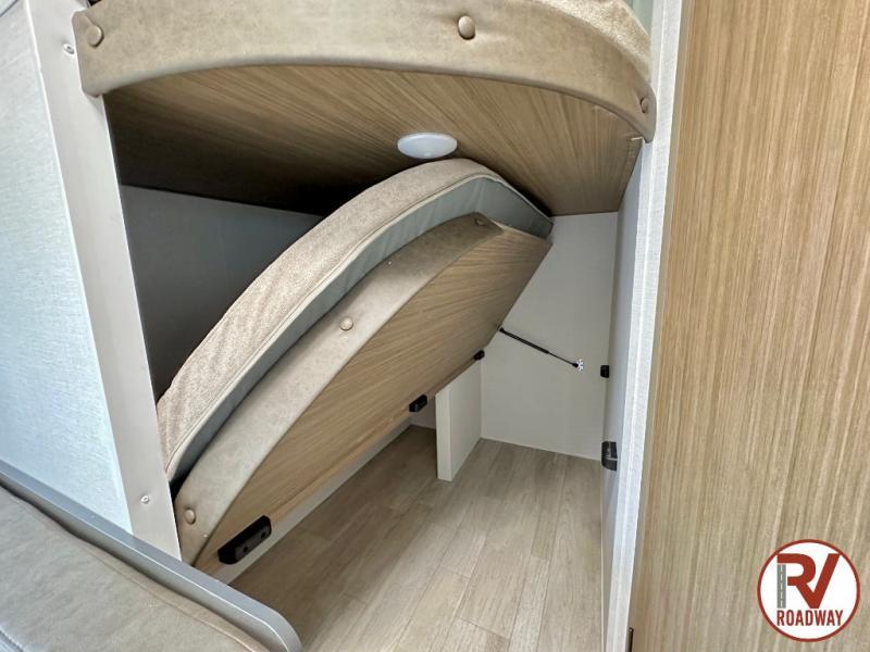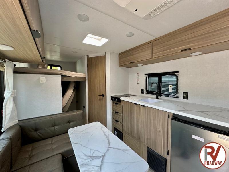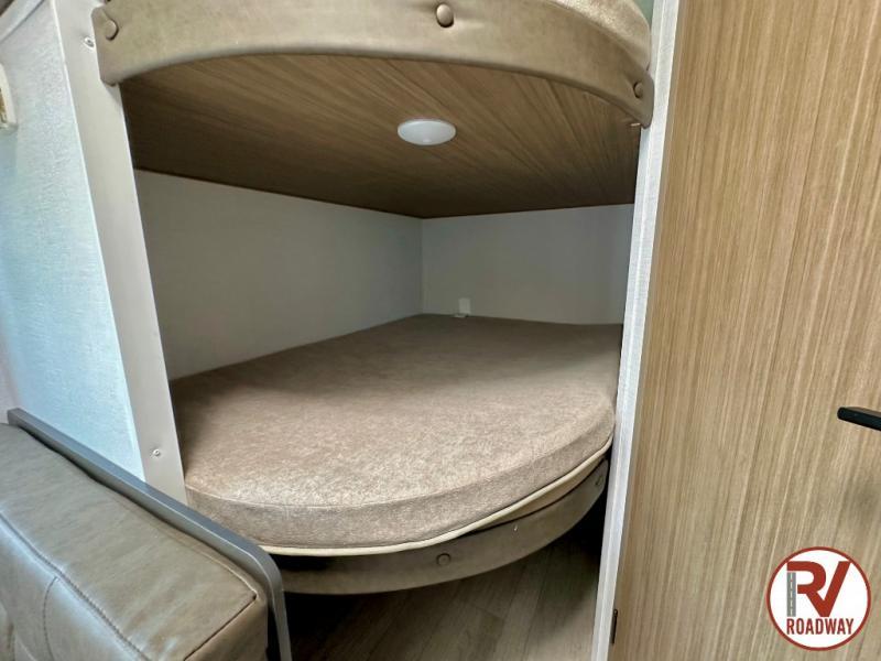 The double-size bunks with storage will be a big selling point in this travel trailer! While your guests take the bunks, you can have the front queen bed all to yourselves, and there is a wardrobe to keep your things organized. A two burner cooktop and microwave will let you make meals each day, and you can dine at the open lounge with a table.
