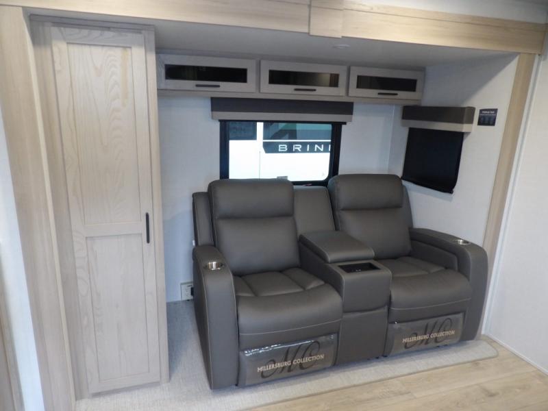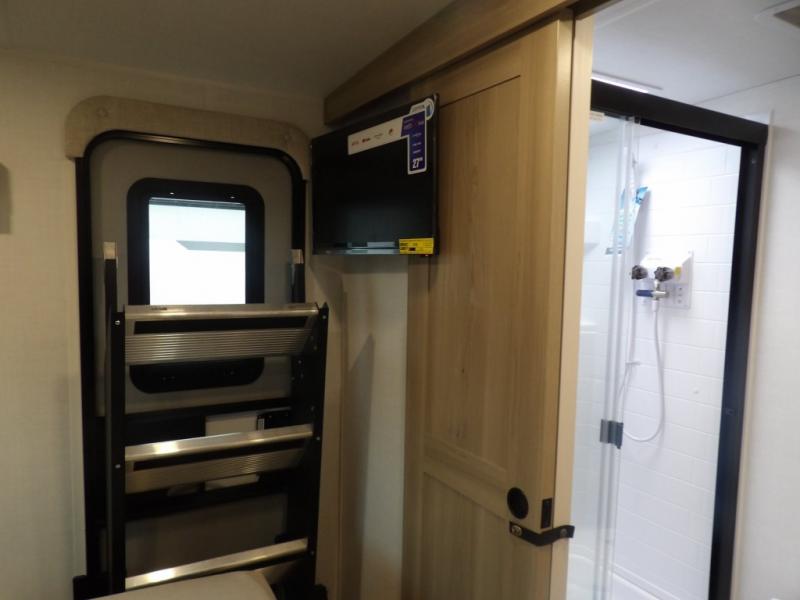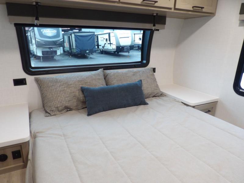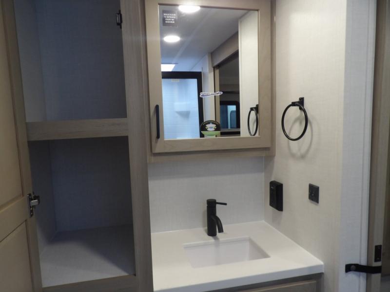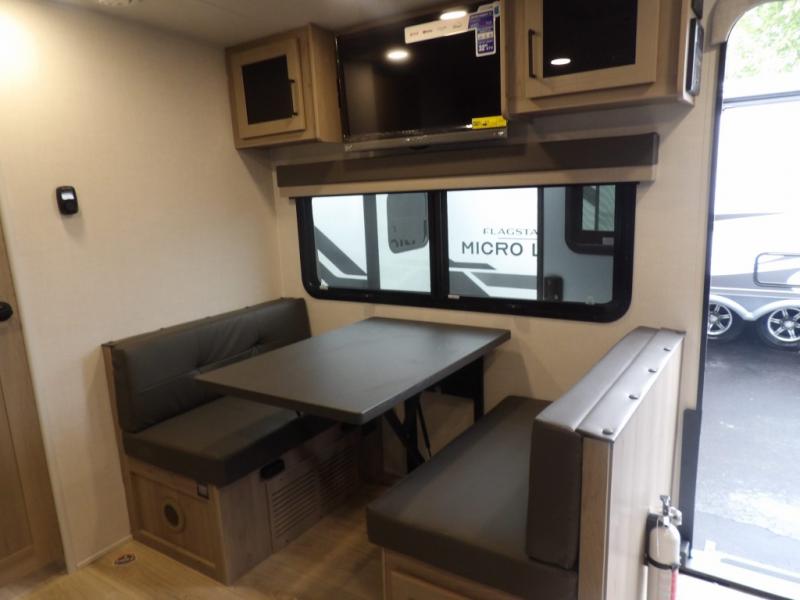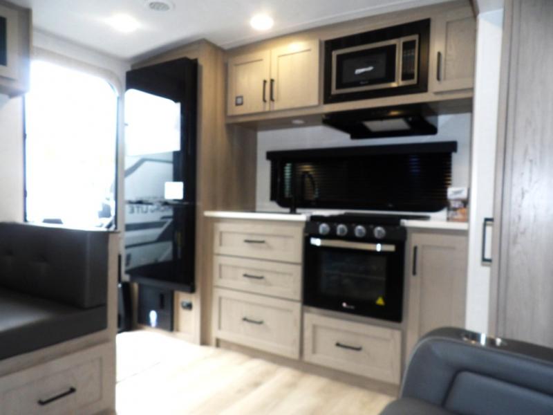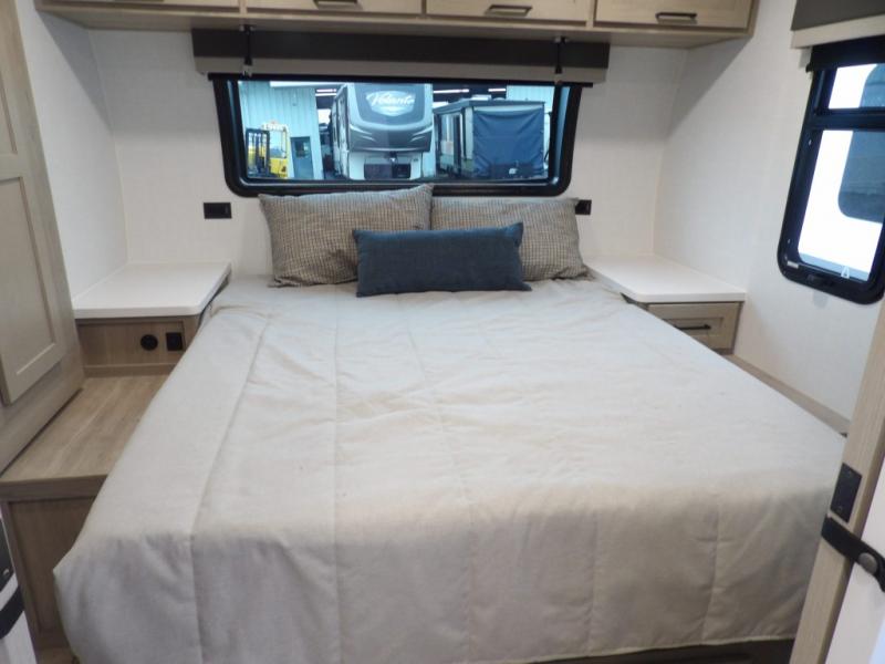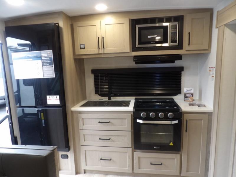 The double-size bunks with storage will be a big selling point in this travel trailer! While your guests take the bunks, you can have the front queen bed all to yourselves, and there is a wardrobe to keep your things organized. A two burner cooktop and microwave will let you make meals each day, and you can dine at the open lounge with a table.