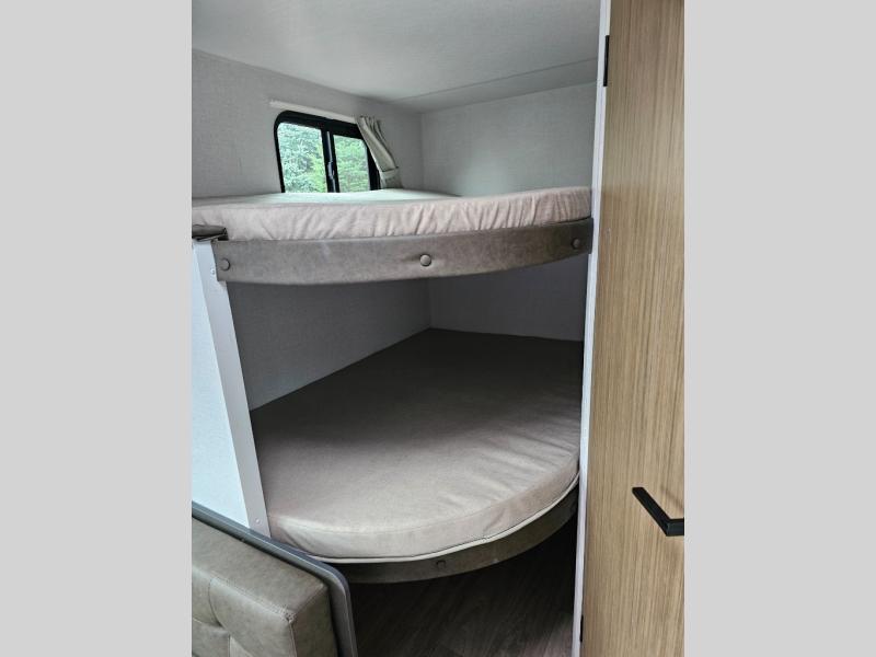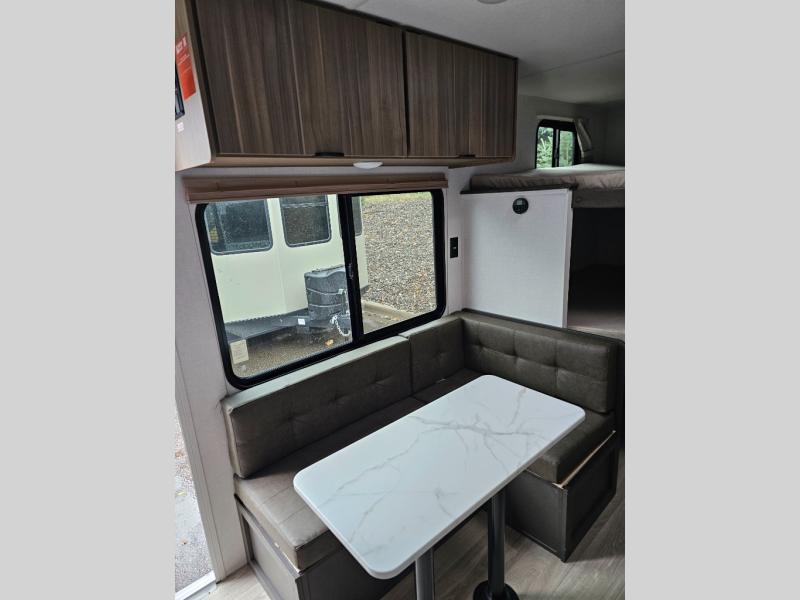 The double-size bunks with storage will be a big selling point in this travel trailer! While your guests take the bunks, you can have the front queen bed all to yourselves, and there is a wardrobe to keep your things organized. A two burner cooktop and microwave will let you make meals each day, and you can dine at the open lounge with a table.