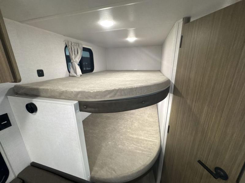 The double-size bunks with storage will be a big selling point in this travel trailer! While your guests take the bunks, you can have the front queen bed all to yourselves, and there is a wardrobe to keep your things organized. A two burner cooktop and microwave will let you make meals each day, and you can dine at the open lounge with a table.