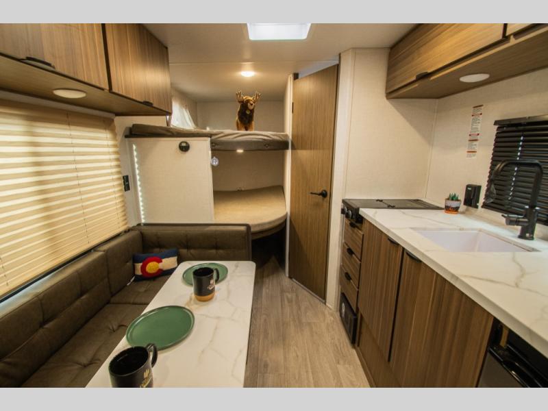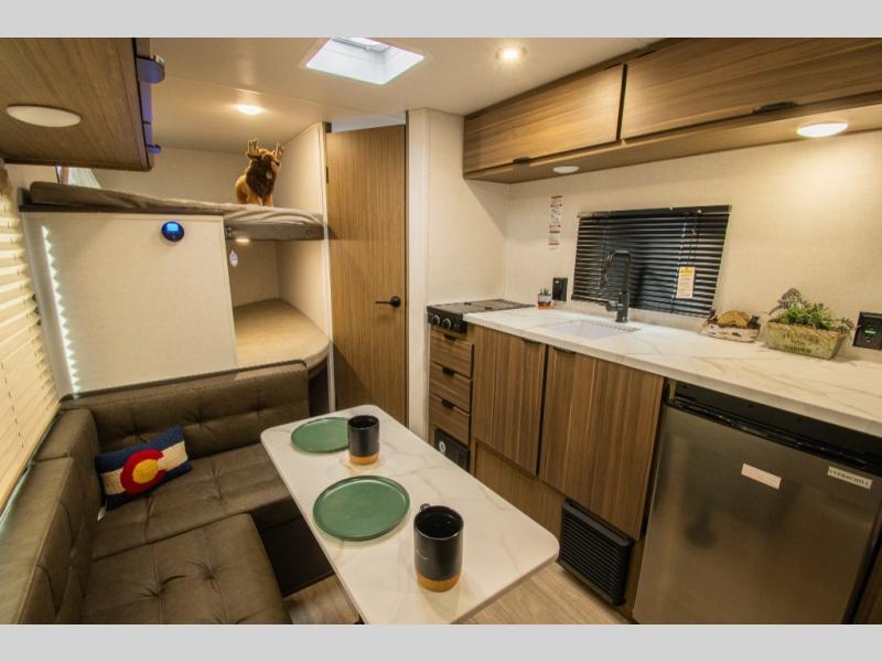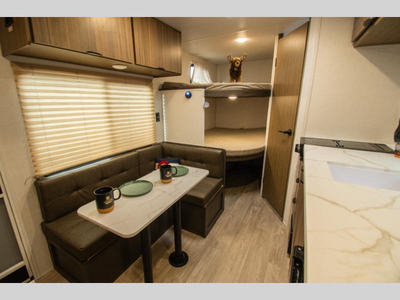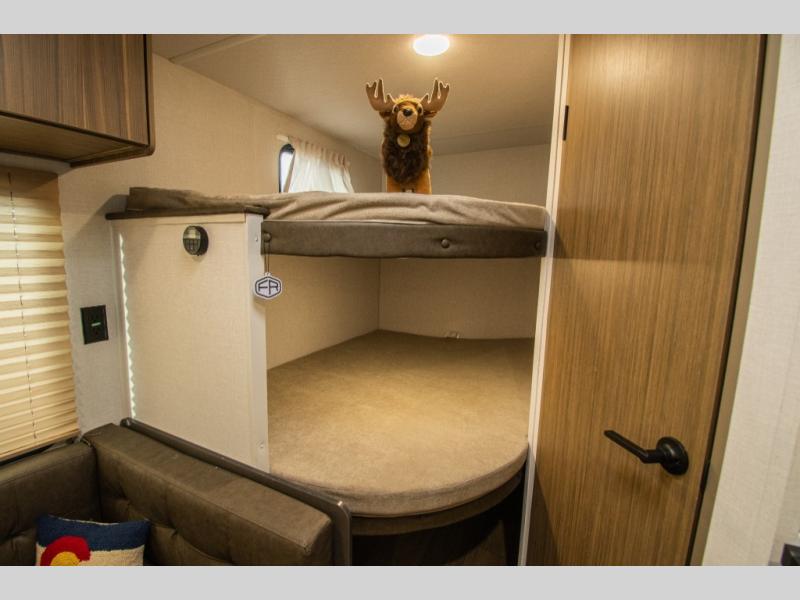 In the rear, double-size bunk beds with built-in storage create dedicated sleeping space for kids or guests, making this trailer a great option for family trips. The central living area includes an open lounge with a table, offering a flexible spot for meals, games, or relaxing indoors.