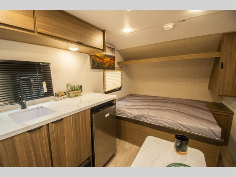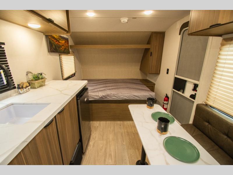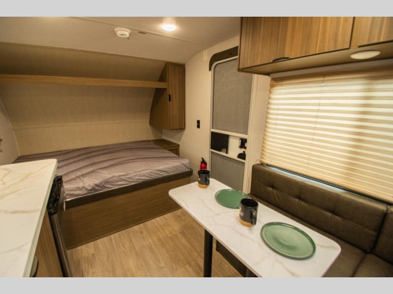 Up front, the queen bed provides a comfortable sleeping area, complete with a wardrobe that keeps clothing and personal items organized. This front sleeping space offers privacy and convenience without sacrificing floor space.