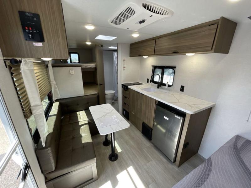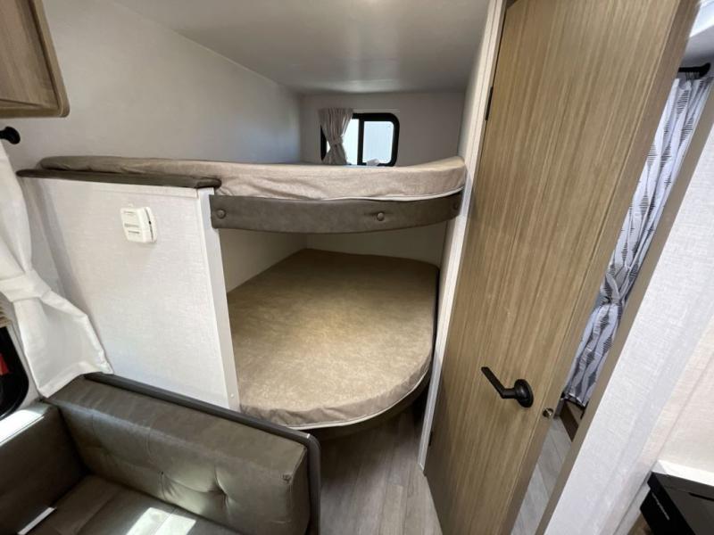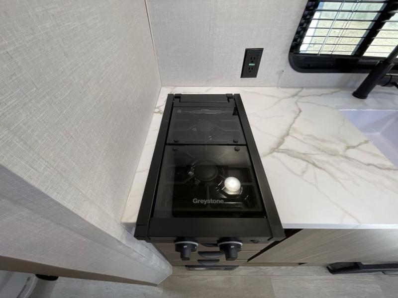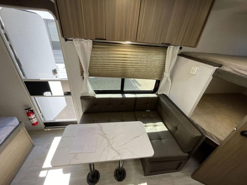 The double-size bunks with storage will be a big selling point in this travel trailer! While your guests take the bunks, you can have the front queen bed all to yourselves, and there is a wardrobe to keep your things organized. A two burner cooktop and microwave will let you make meals each day, and you can dine at the open lounge with a table.