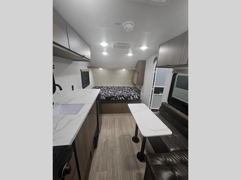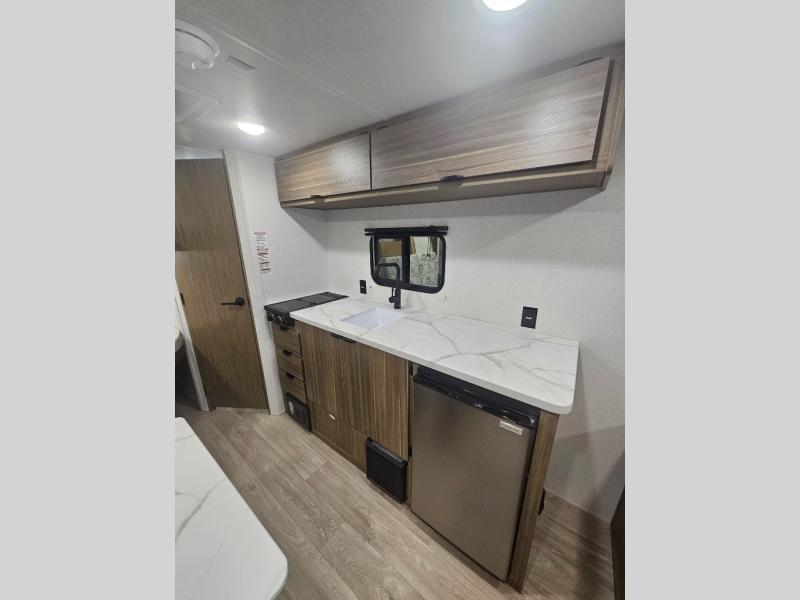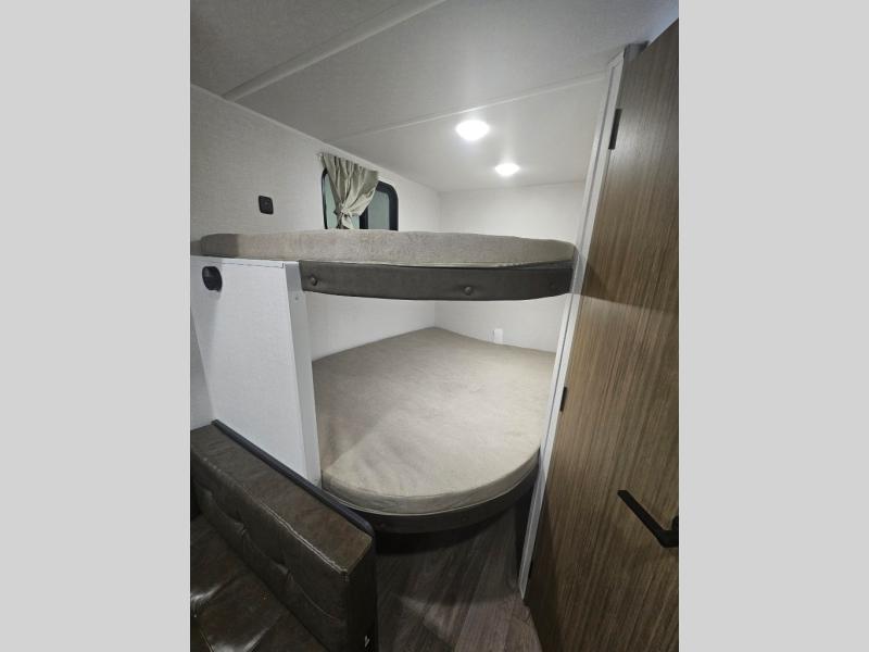 The double-size bunks with storage will be a big selling point in this travel trailer! While your guests take the bunks, you can have the front queen bed all to yourselves, and there is a wardrobe to keep your things organized. A two-burner cooktop and microwave will let you make meals each day, and you can dine at the open lounge with a table.