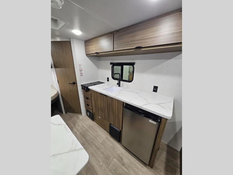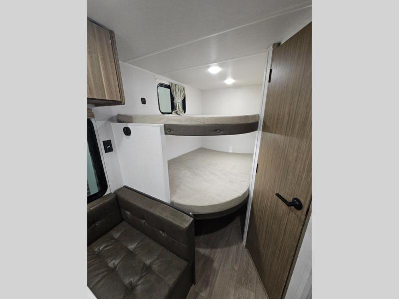 The double-size bunks with storage will be a big selling point in this travel trailer! While your guests take the bunks, you can have the front queen bed all to yourselves, and there is a wardrobe to keep your things organized. A two-burner cooktop and microwave will let you make meals each day, and you can dine at the open lounge with a table.