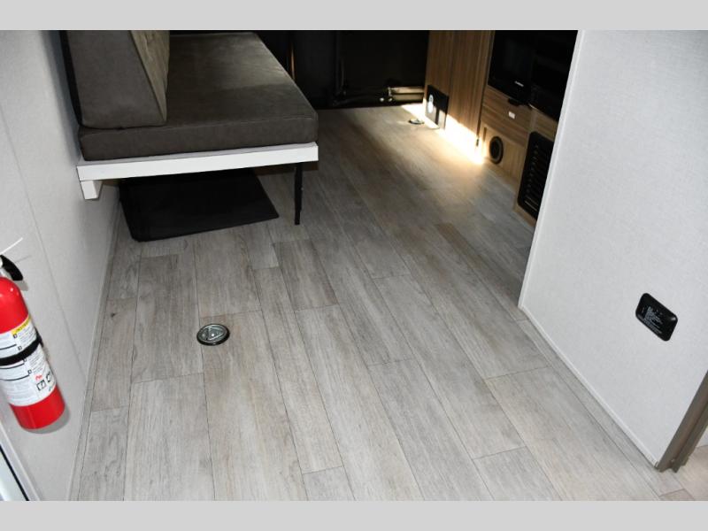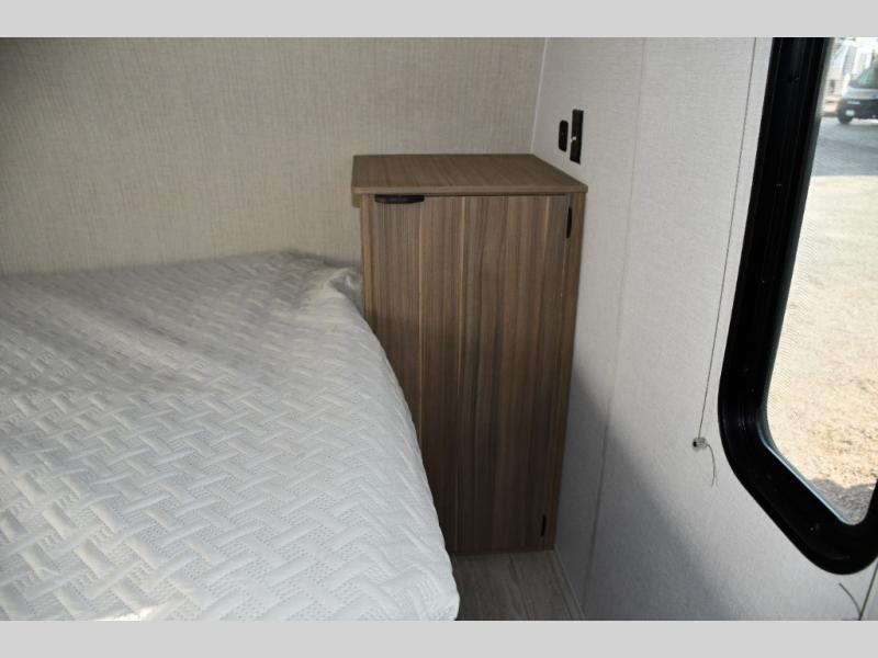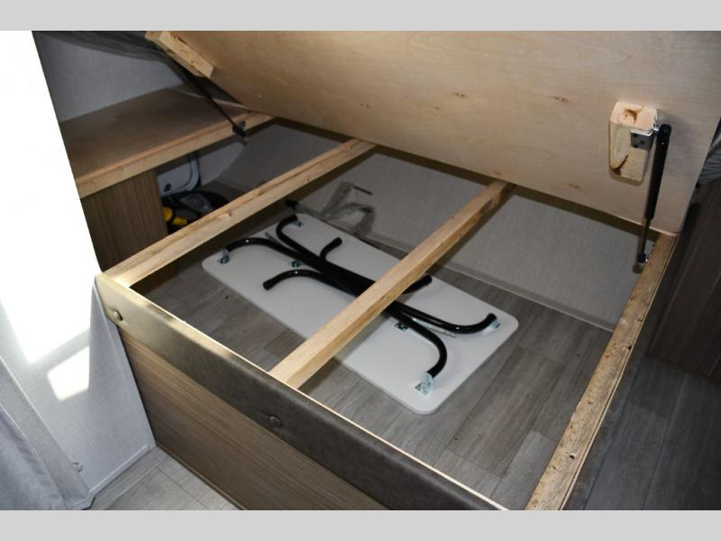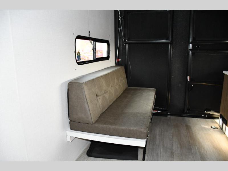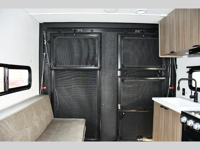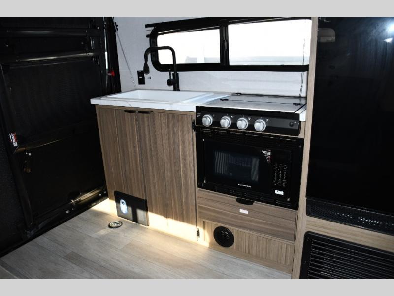 Includes a 12V refrigerator, two-burner cooktop, microwave, seamless countertops, and storage for meal prep on or off the grid. -