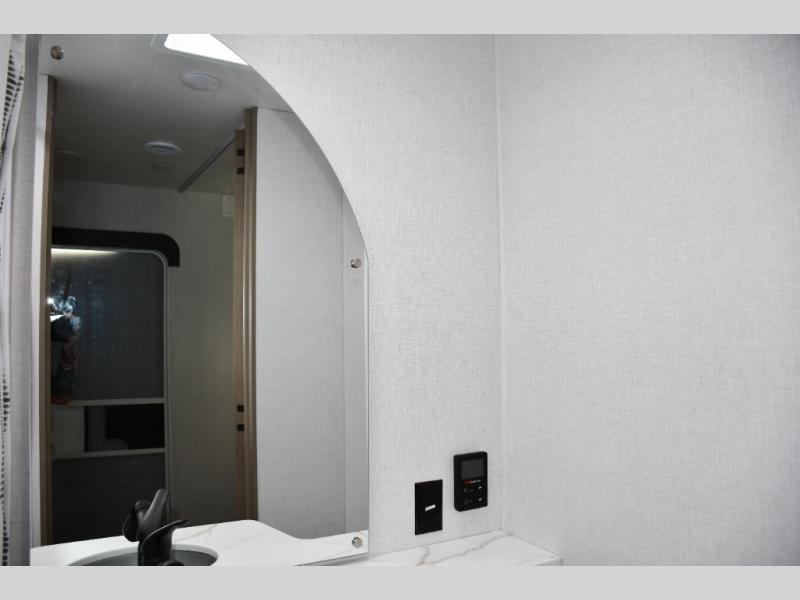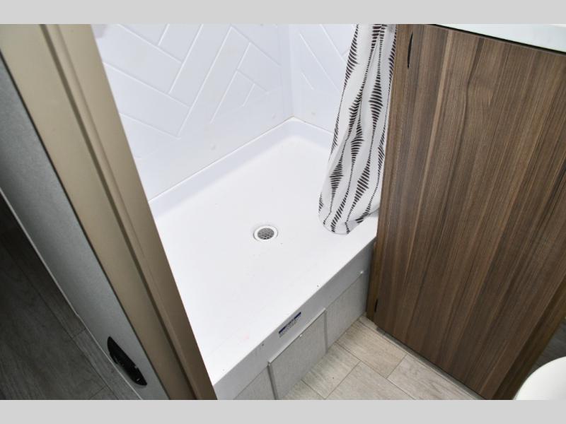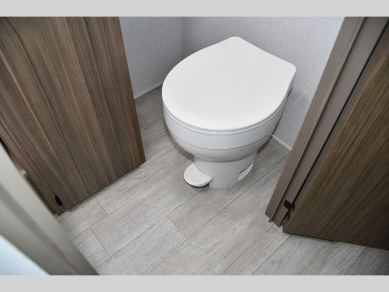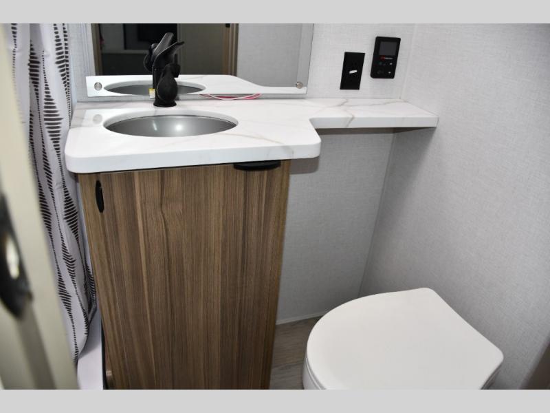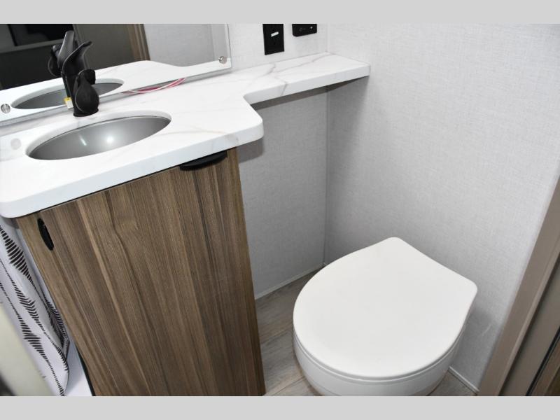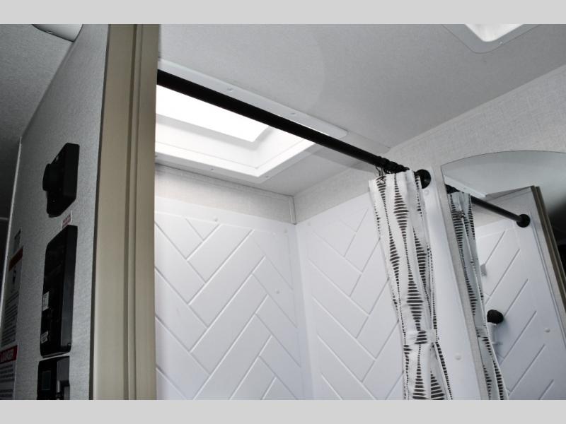 Equipped with a shower skylight for extra headroom and natural light, plus a foot-flush toilet and vanity sink. -