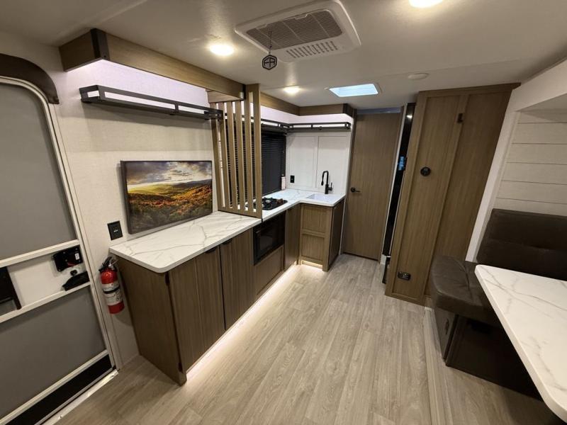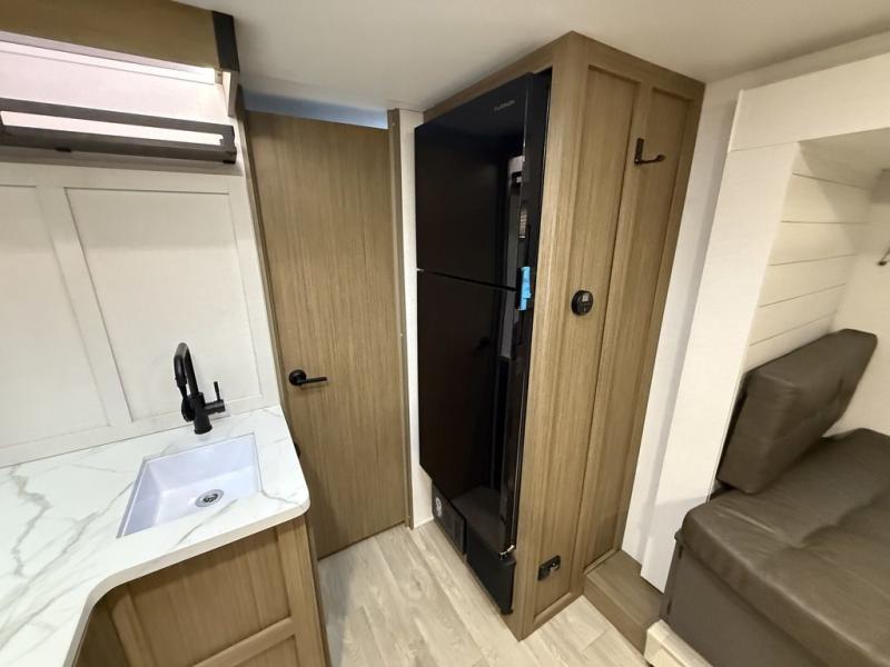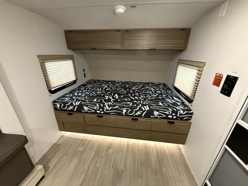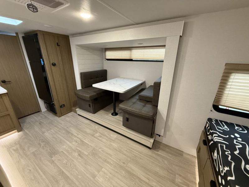 It will be so easy to enjoy time spent in this travel trailer for three. The front queen bed provides a great night's rest, and there is an overhead cabinet to keep your things organized. A two-burner cooktop in the kitchen will let you make meals for your crew, and a refrigerator keeps leftovers fresh. You can dine at the booth dinette within the slide out or take your plate outdoors to sit under the 12' power awning. And a full rear bath with a shower, toilet, and large vanity counter lets you stay clean each day!