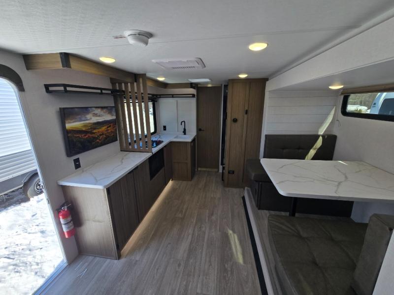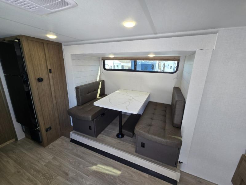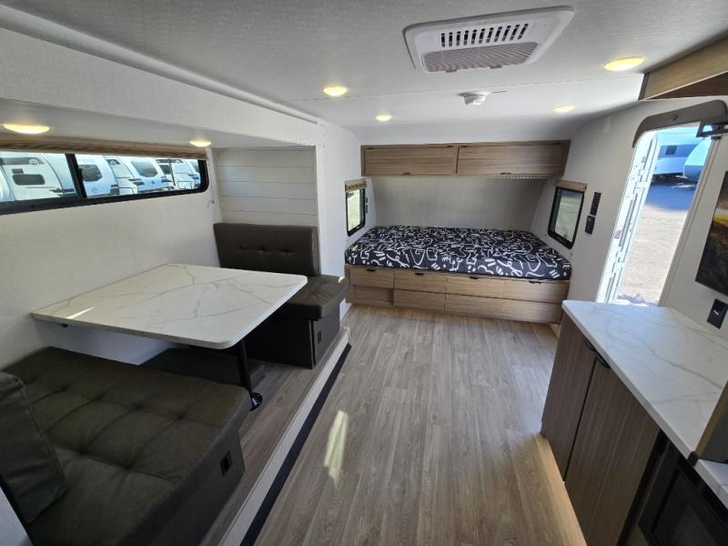 It will be so easy to enjoy time spent in this travel trailer for three. The front queen bed provides a great night's rest, and there is an overhead cabinet to keep your things organized. A two-burner cooktop in the kitchen will let you make meals for your crew, and a refrigerator keeps leftovers fresh. You can dine at the booth dinette within the slide out or take your plate outdoors to sit under the 12' power awning. And a full rear bath with a shower, toilet, and large vanity counter lets you stay clean each day!